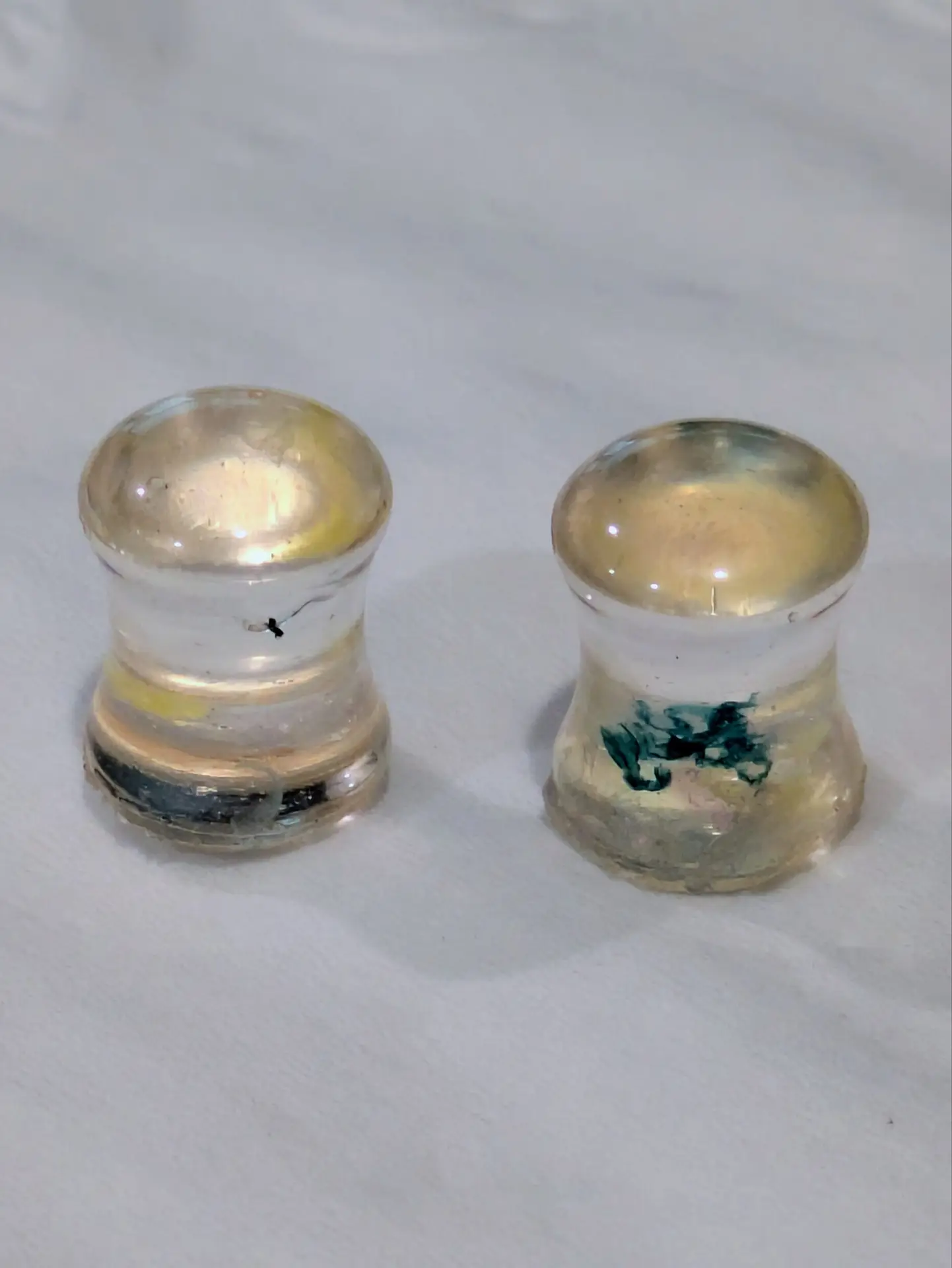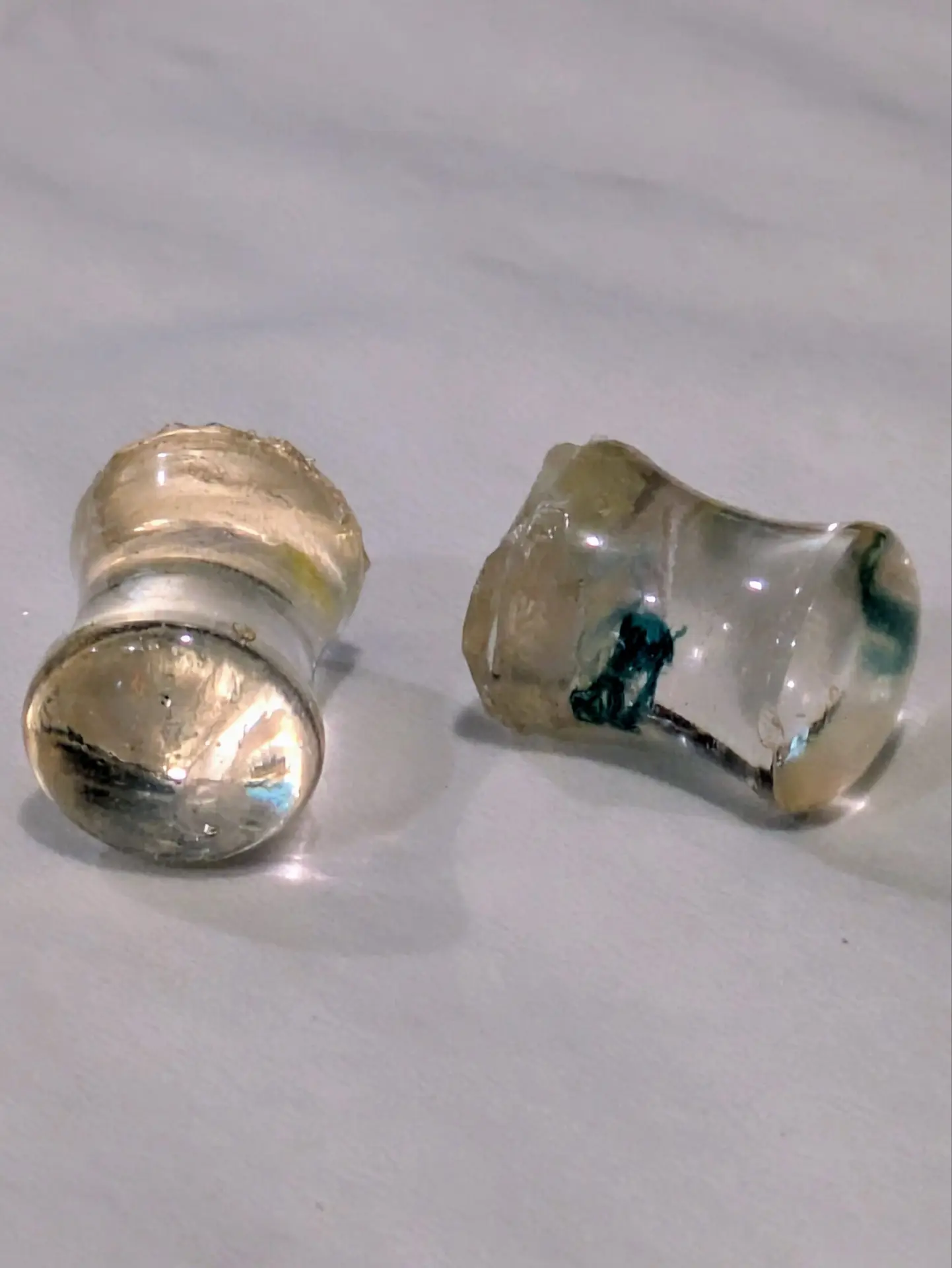 Handmade and one of a kind resin gauges for stretched ears made with Up-Cycled UV & Metallic Polypro Shavings from our Hoops!