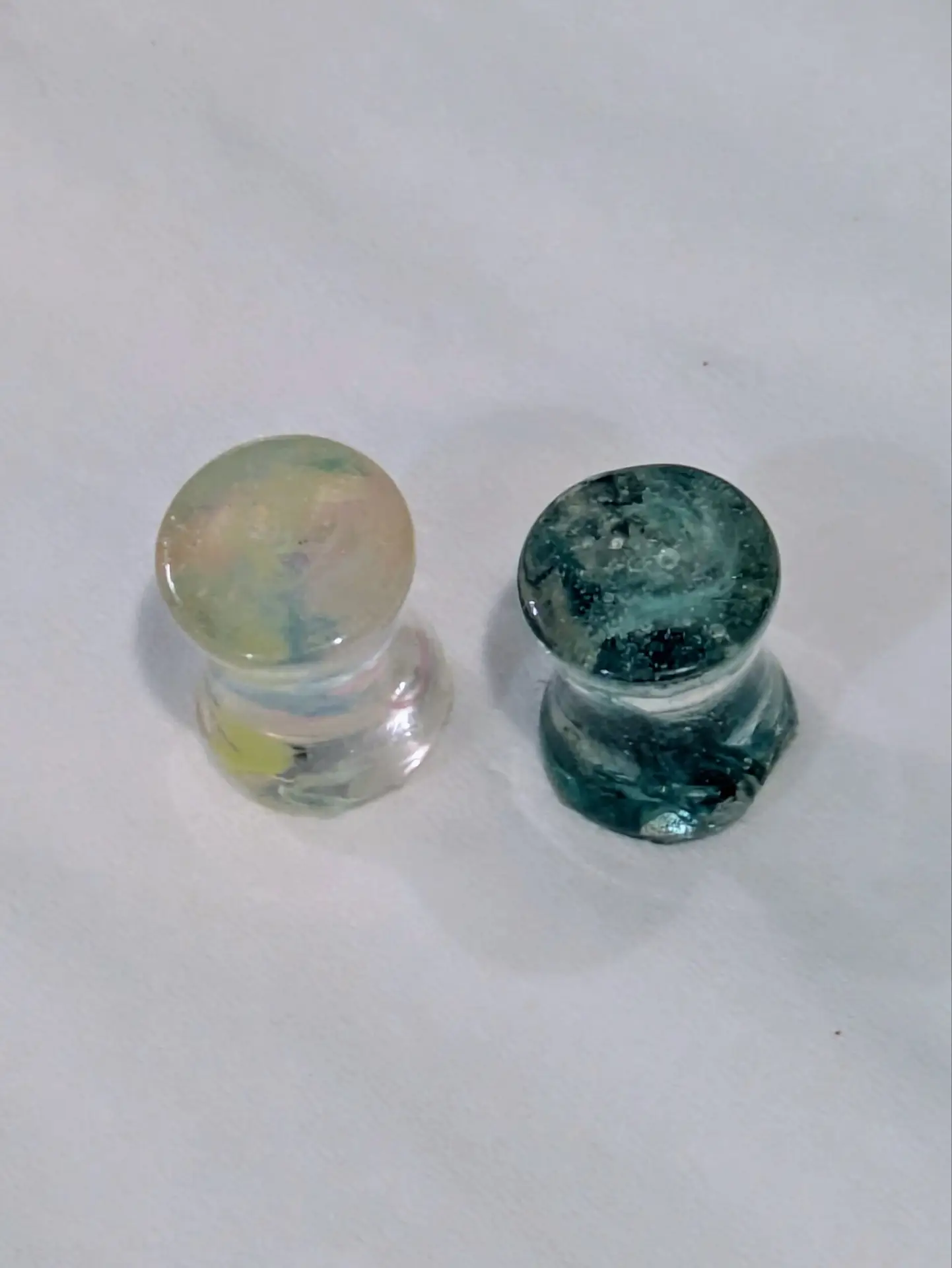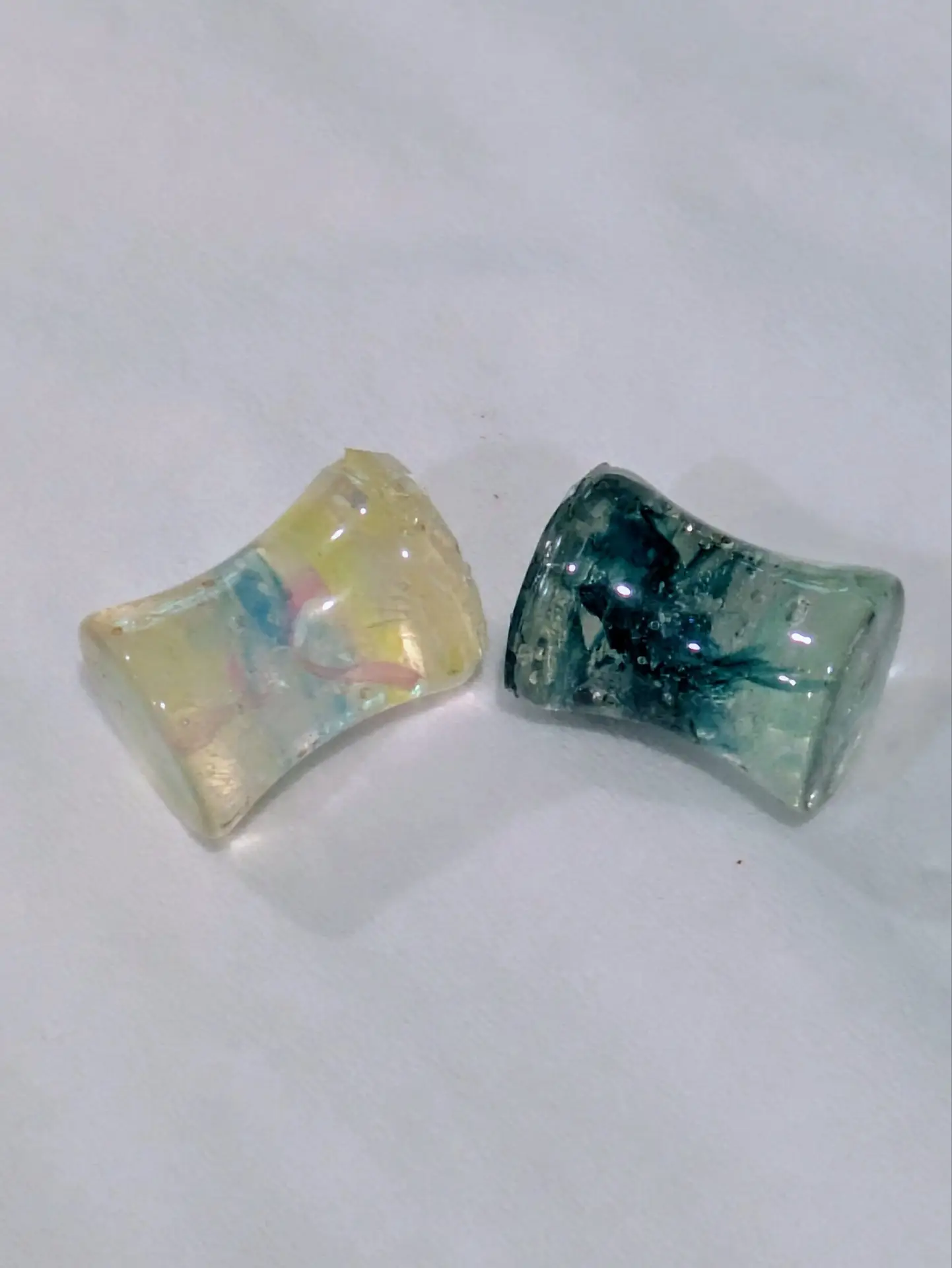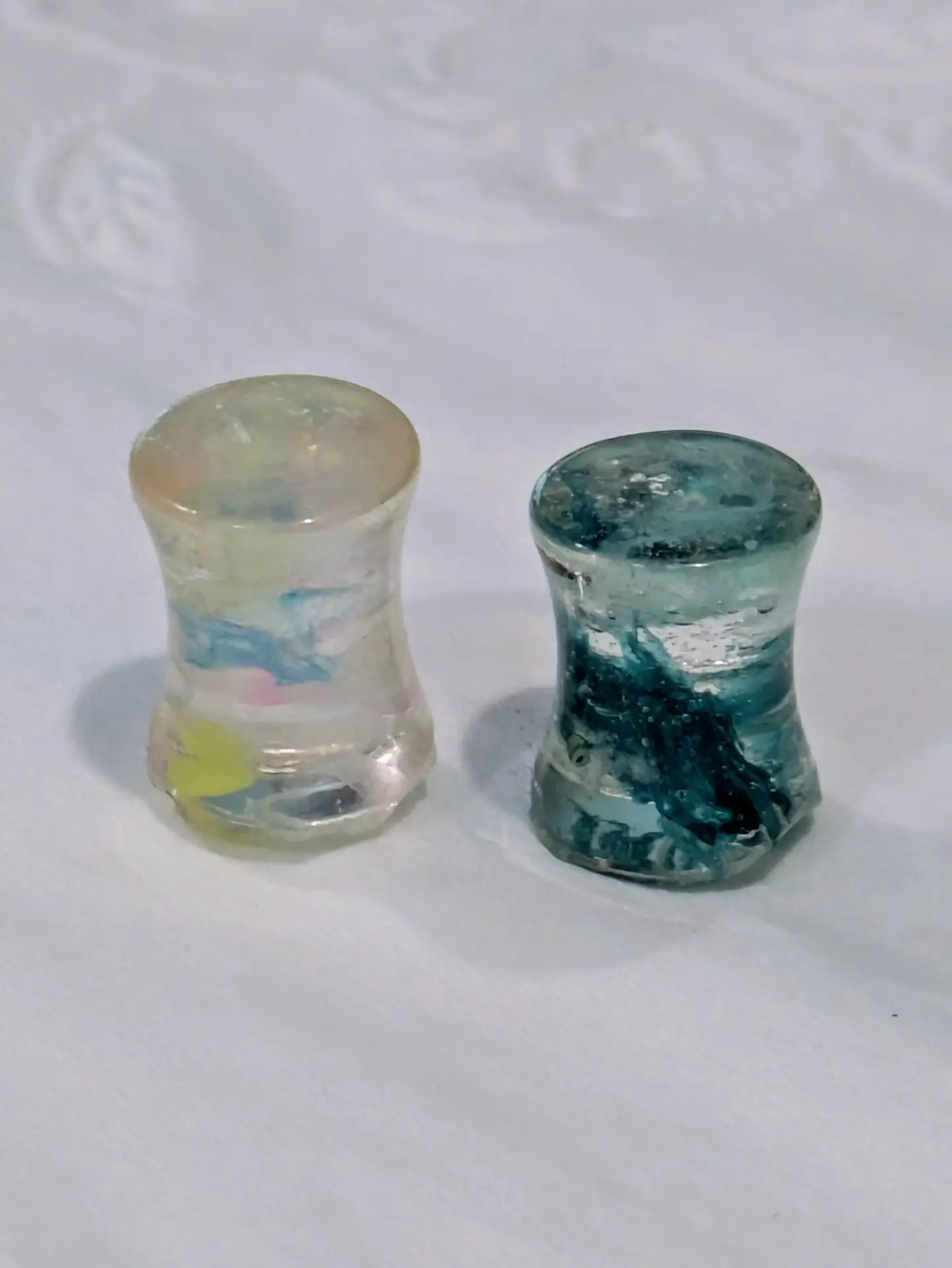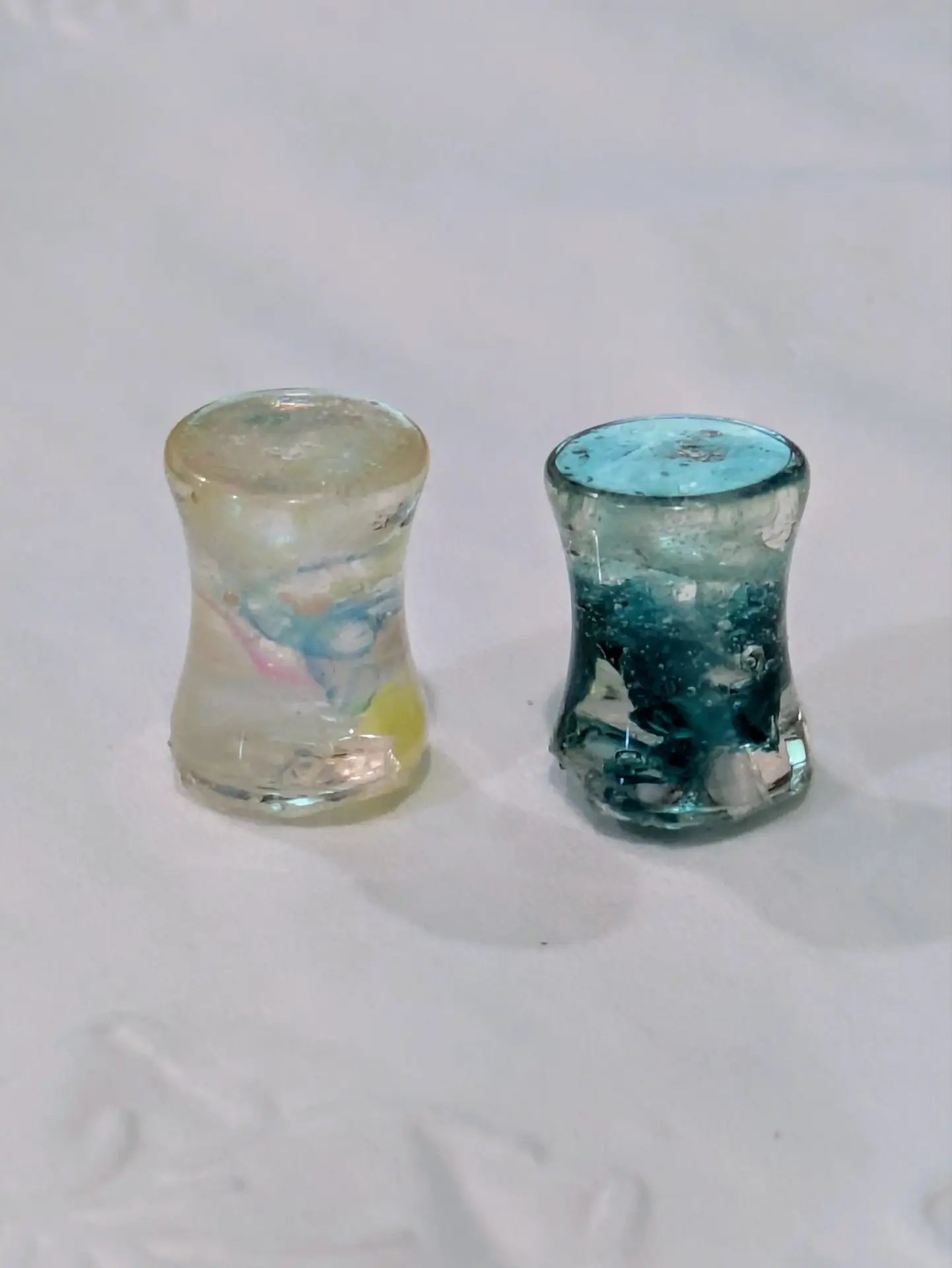 Handmade and one of a kind resin gauges for stretched ears made with Up-Cycled UV & Metallic Polypro Shavings from our Hoops!