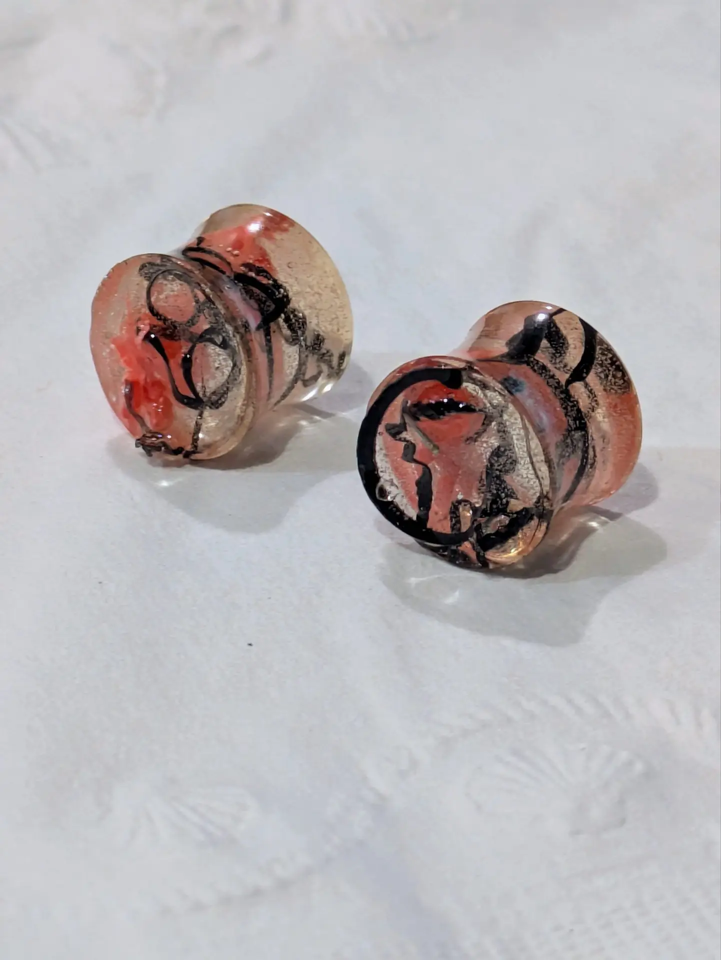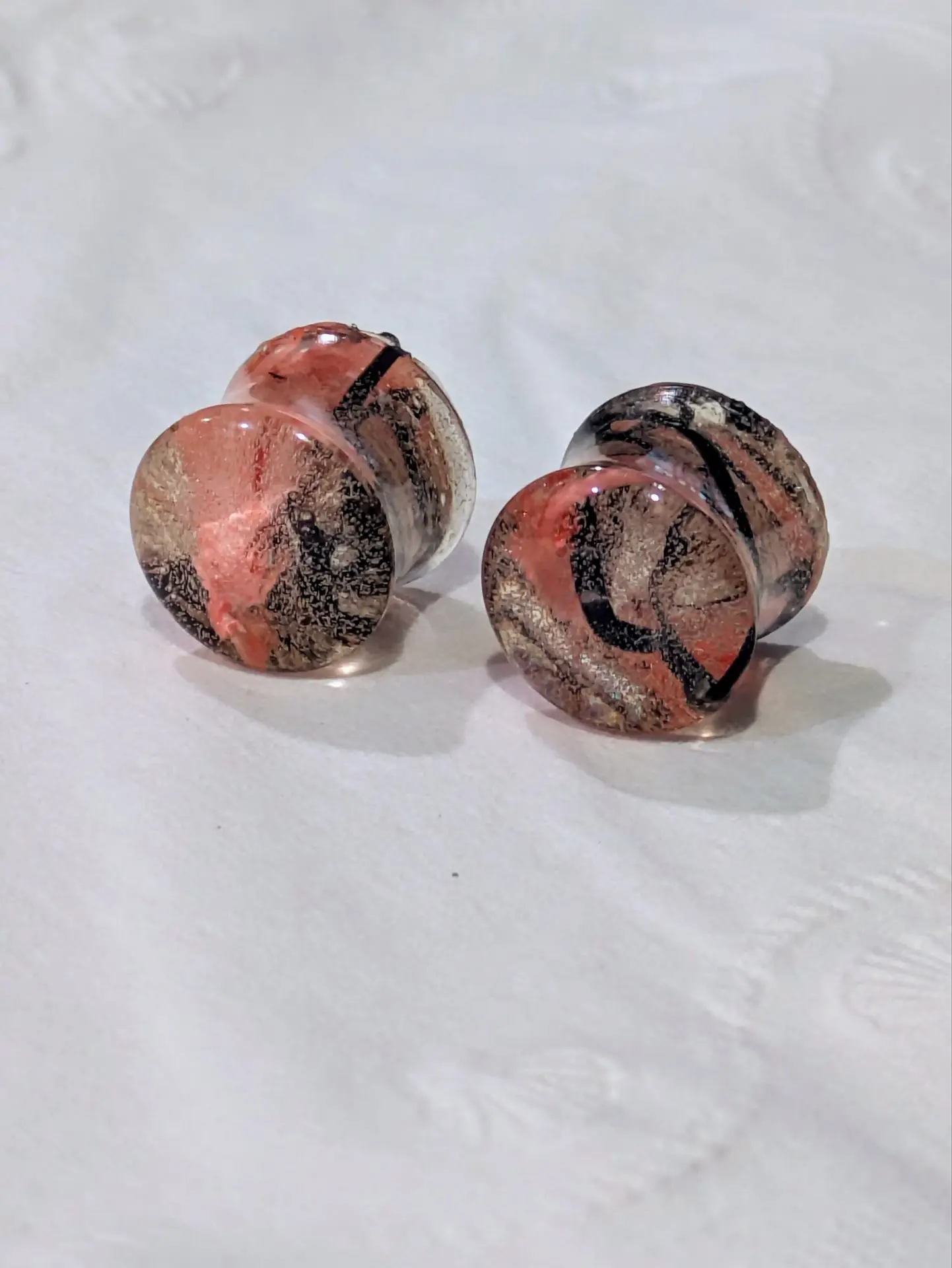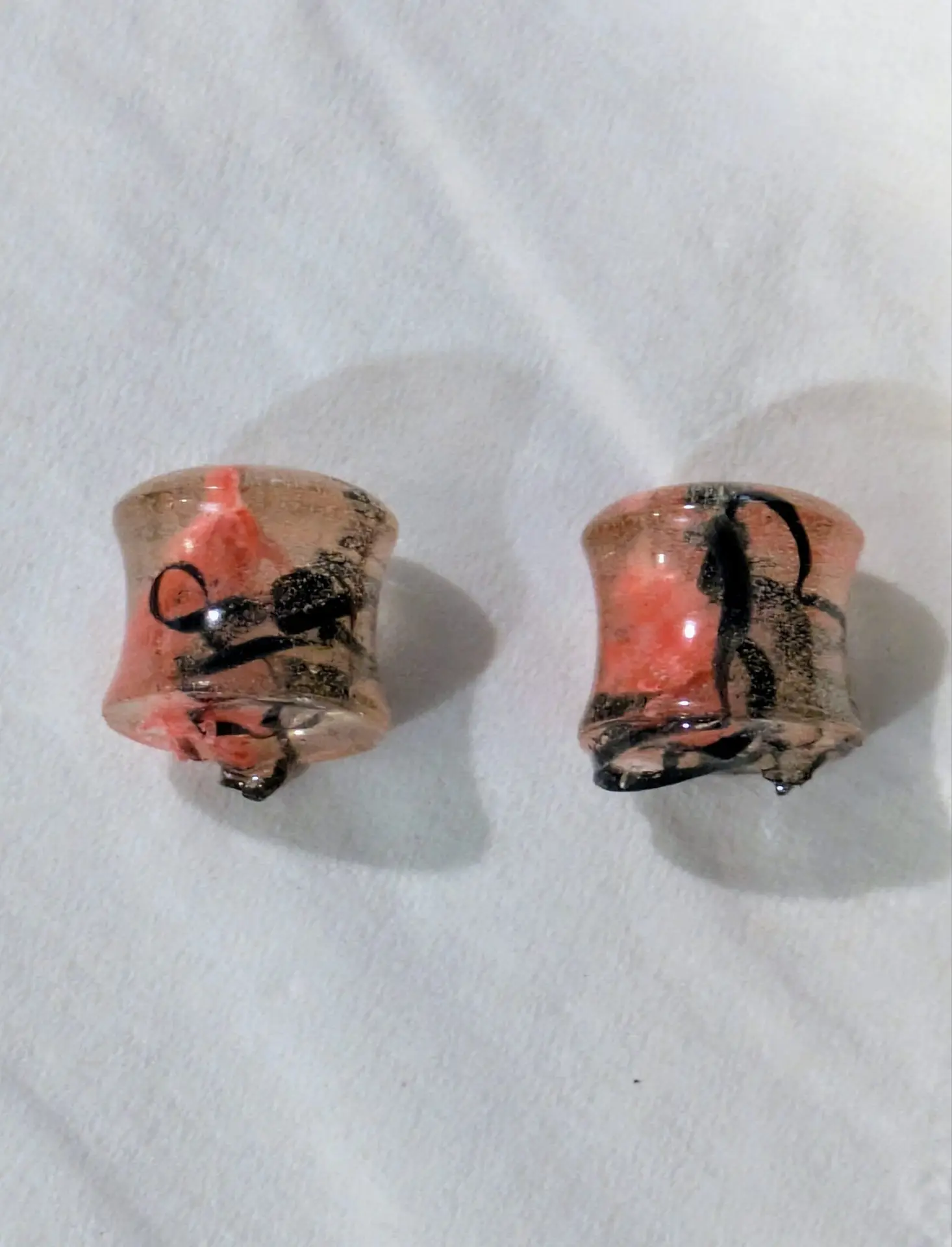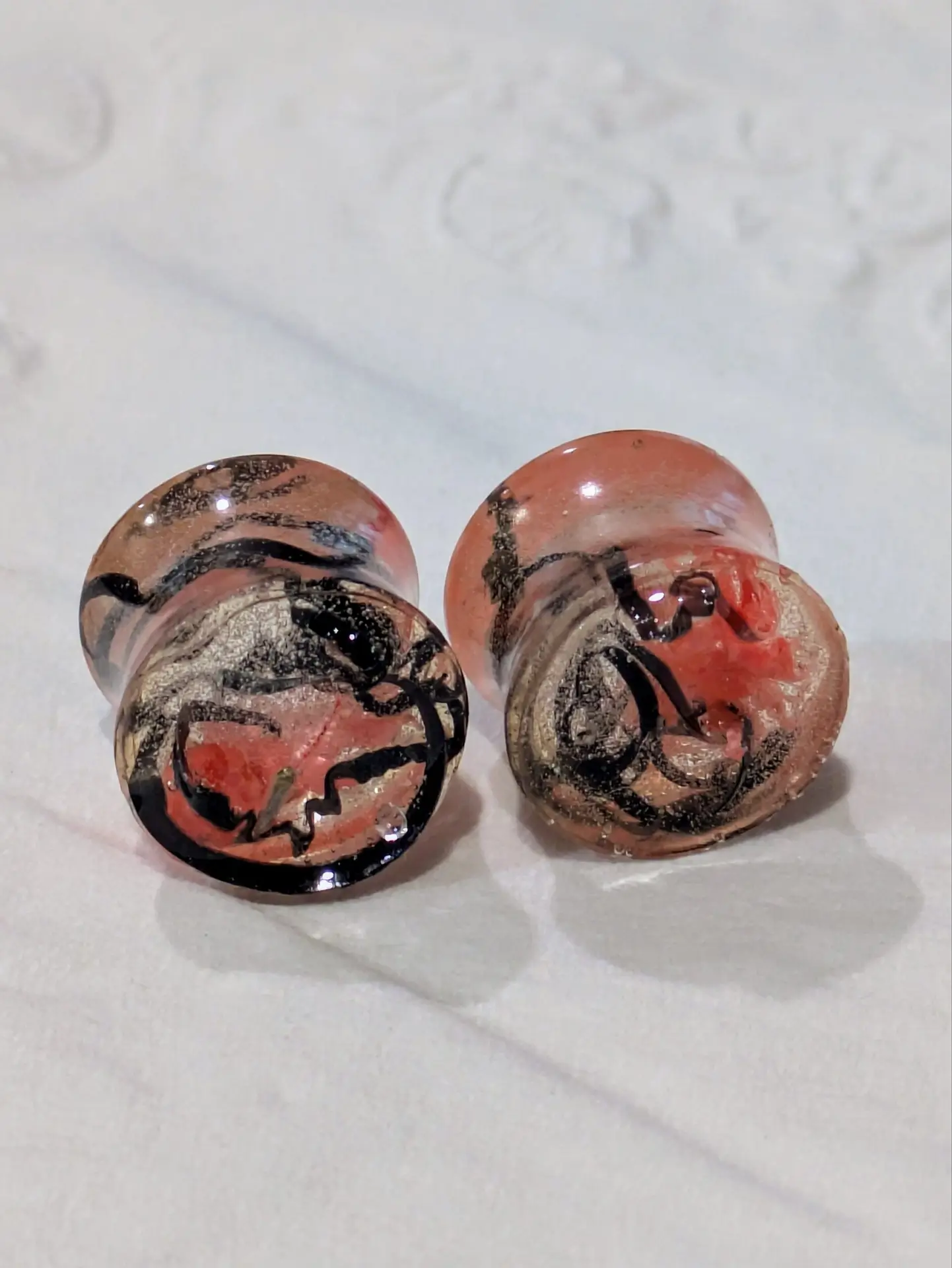 Handmade and one of a kind resin gauges for stretched ears made with Up-Cycled UV & Metallic Polypro Shavings from our Hoops!