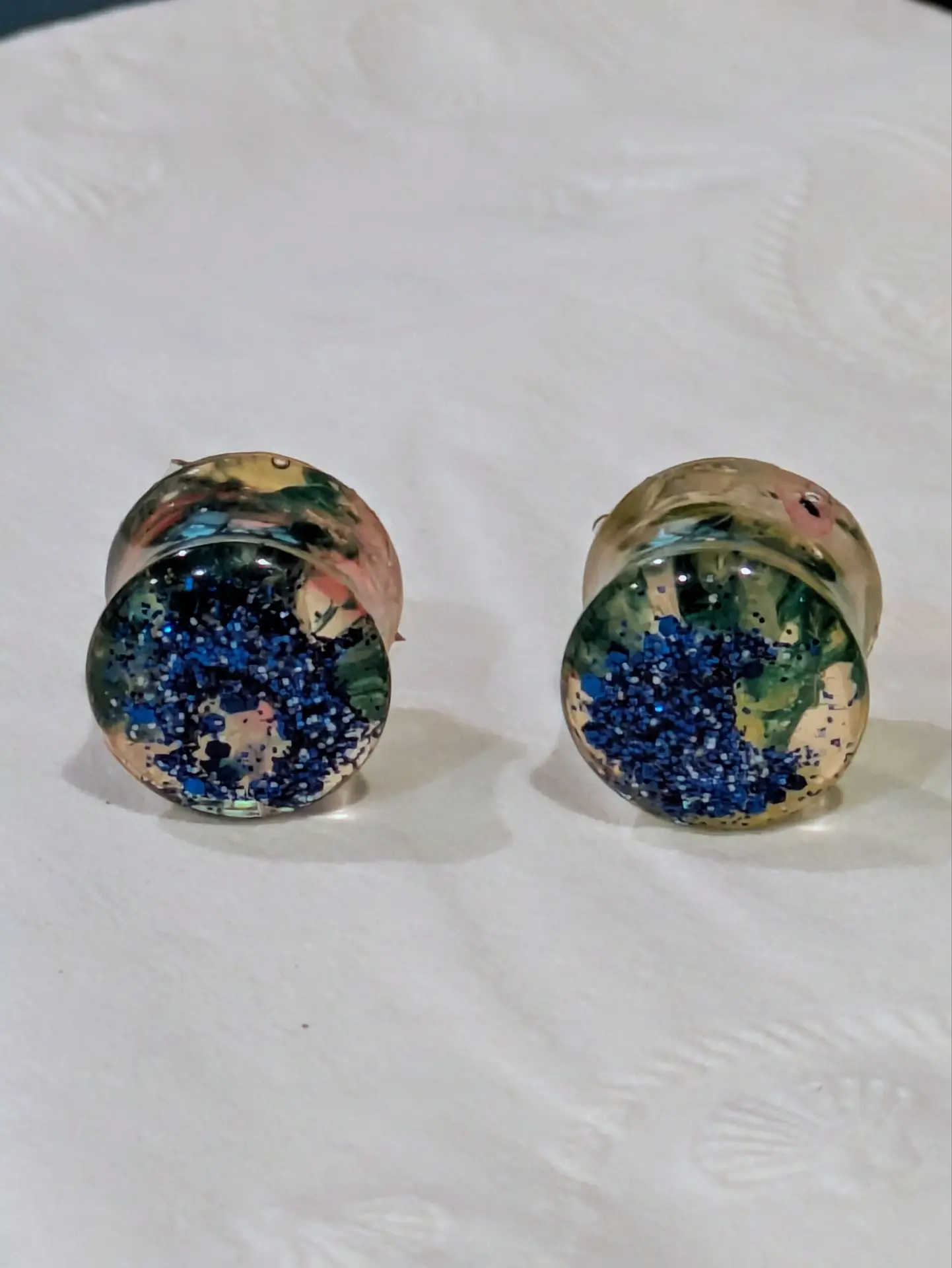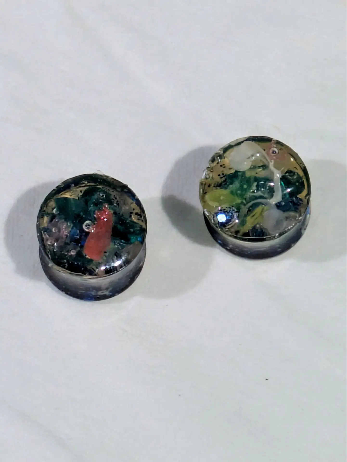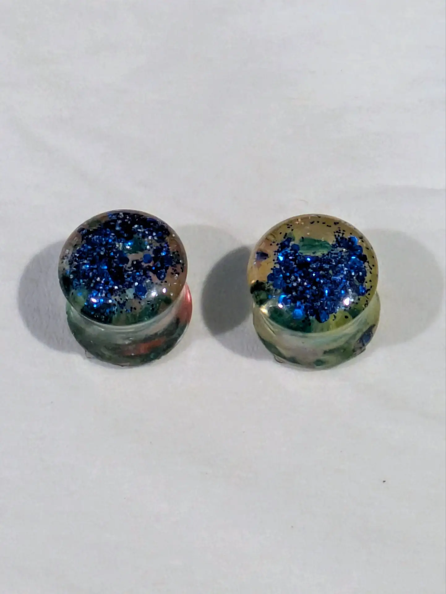 Handmade and one of a kind resin gauges for stretched ears made with Up-Cycled UV & Metallic Polypro Shavings from our Hoops!