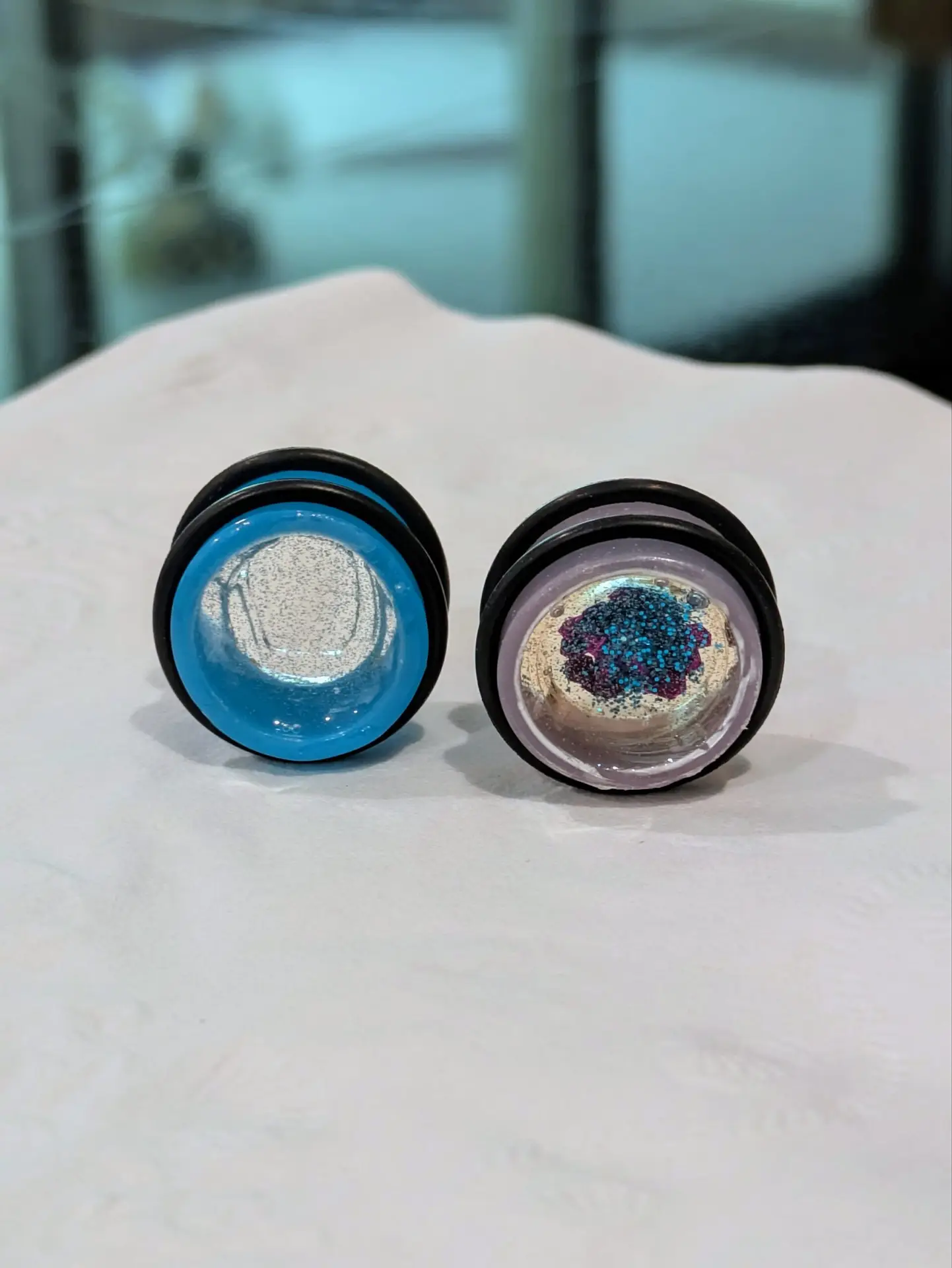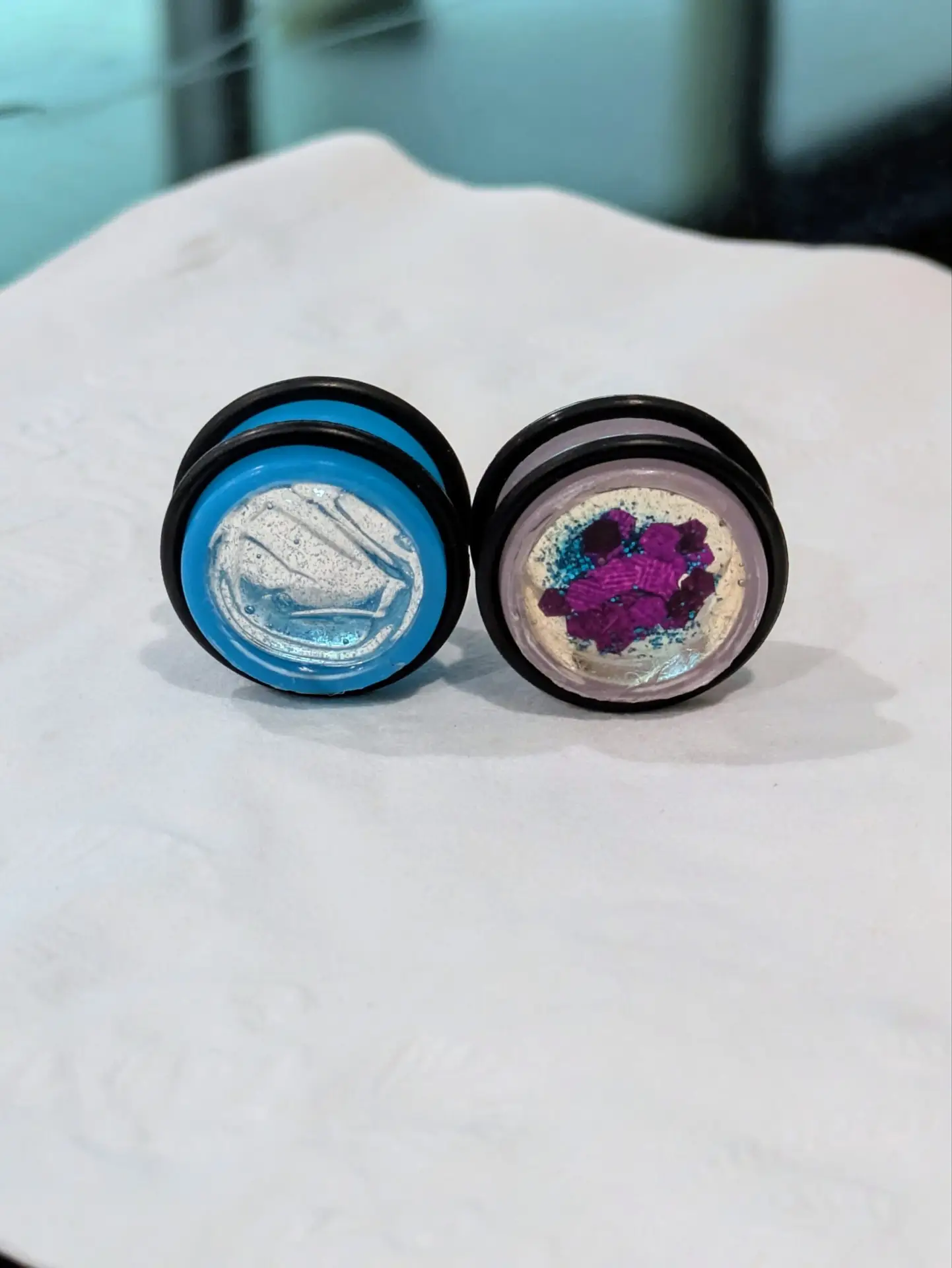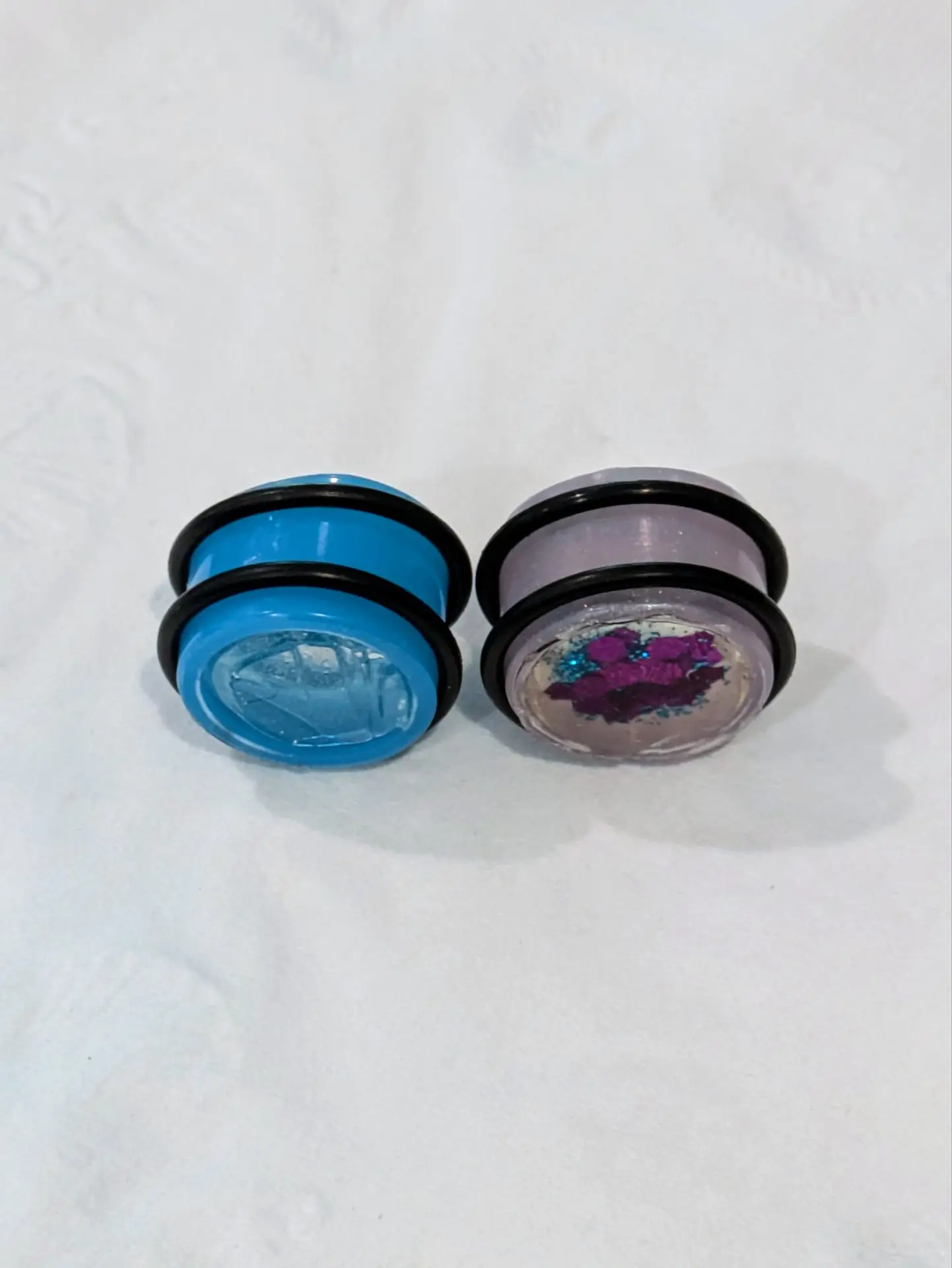 Handmade and one of a kind resin gauges for stretched ears made with Up-Cycled UV & Metallic Polypro Shavings from our Hoops!