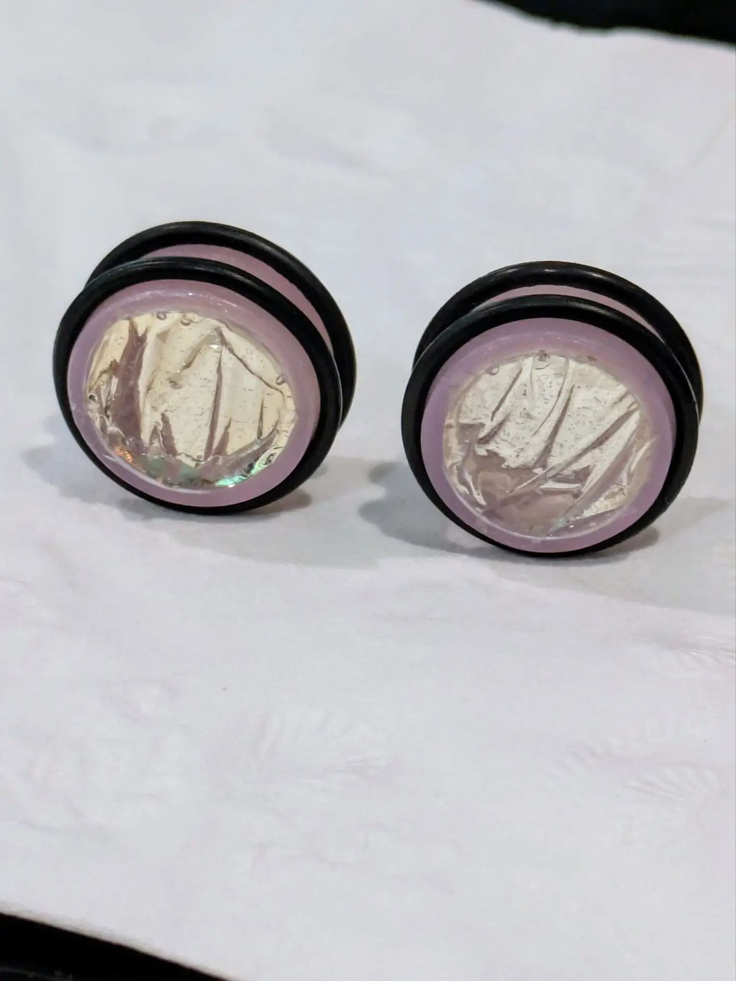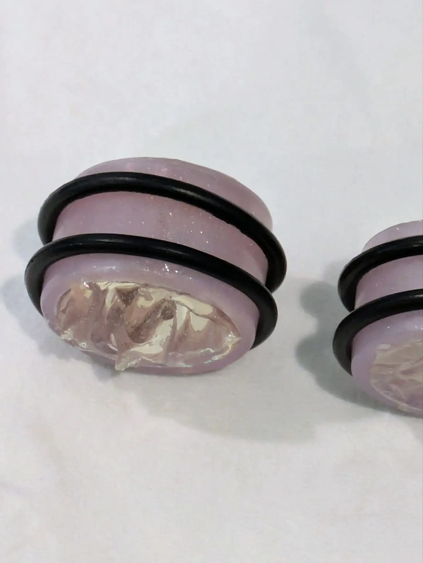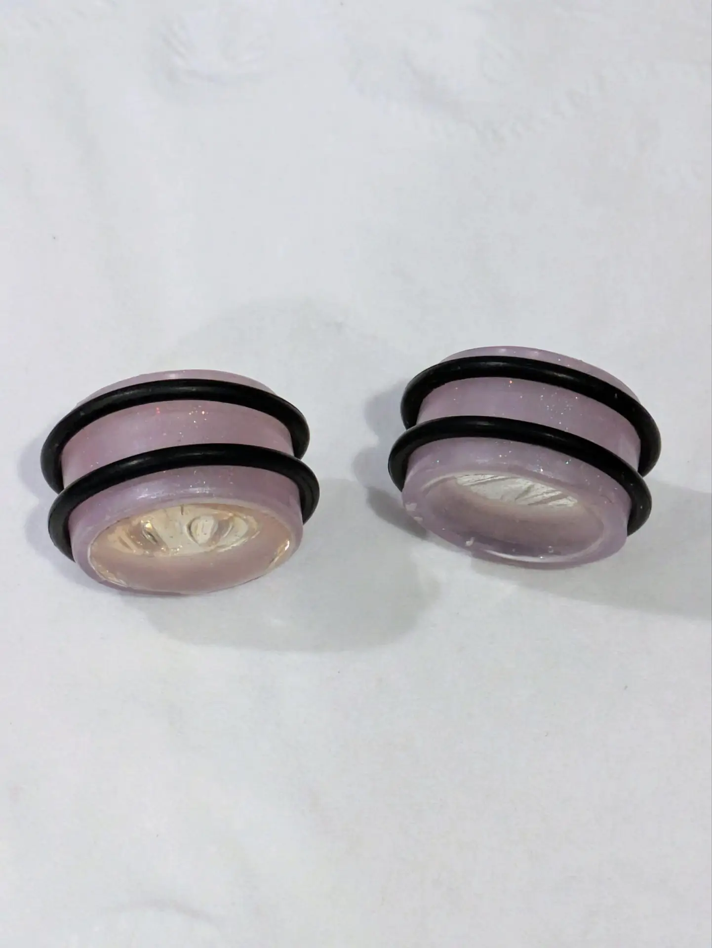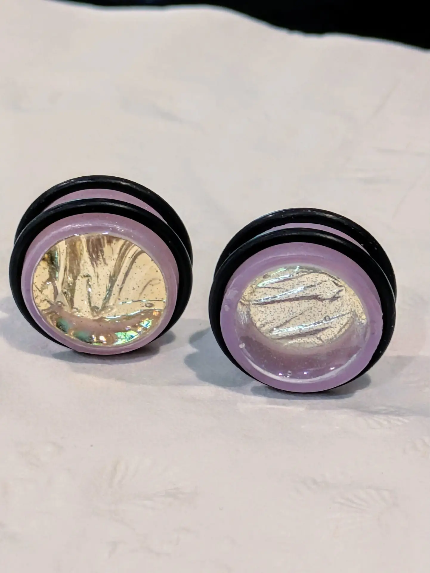 Handmade and one of a kind resin gauges for stretched ears made with Up-Cycled UV & Metallic Polypro Shavings from our Hoops!