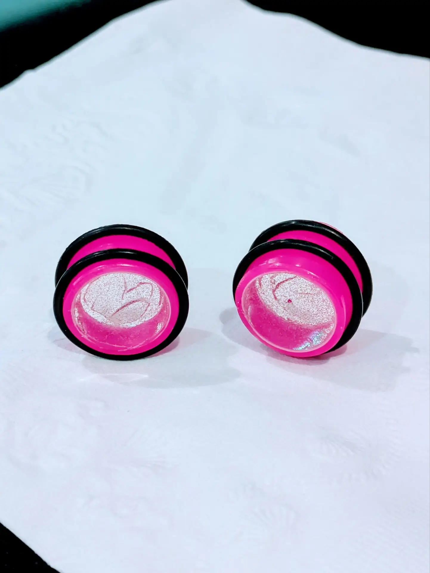 Handmade and one of a kind resin gauges for stretched ears made with Up-Cycled UV & Metallic Polypro Shavings from our Hoops!