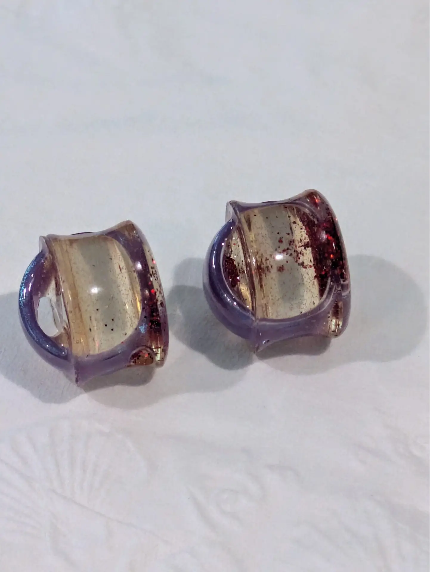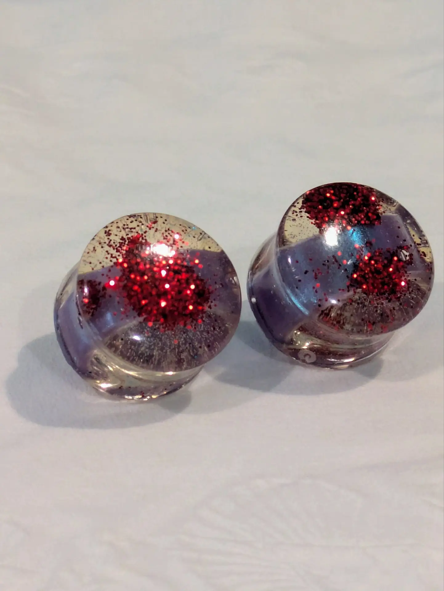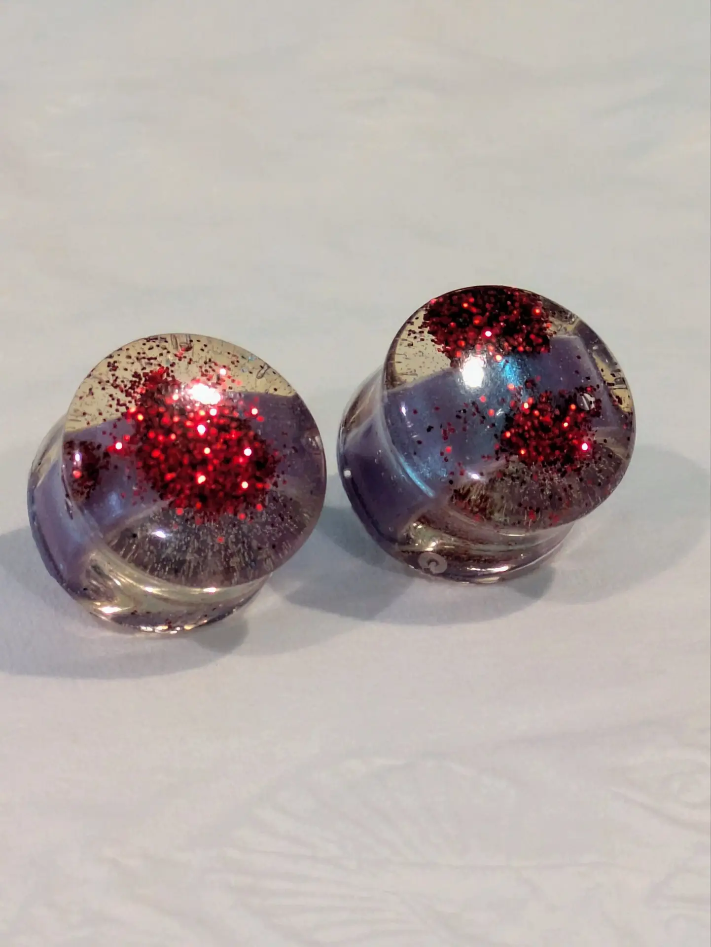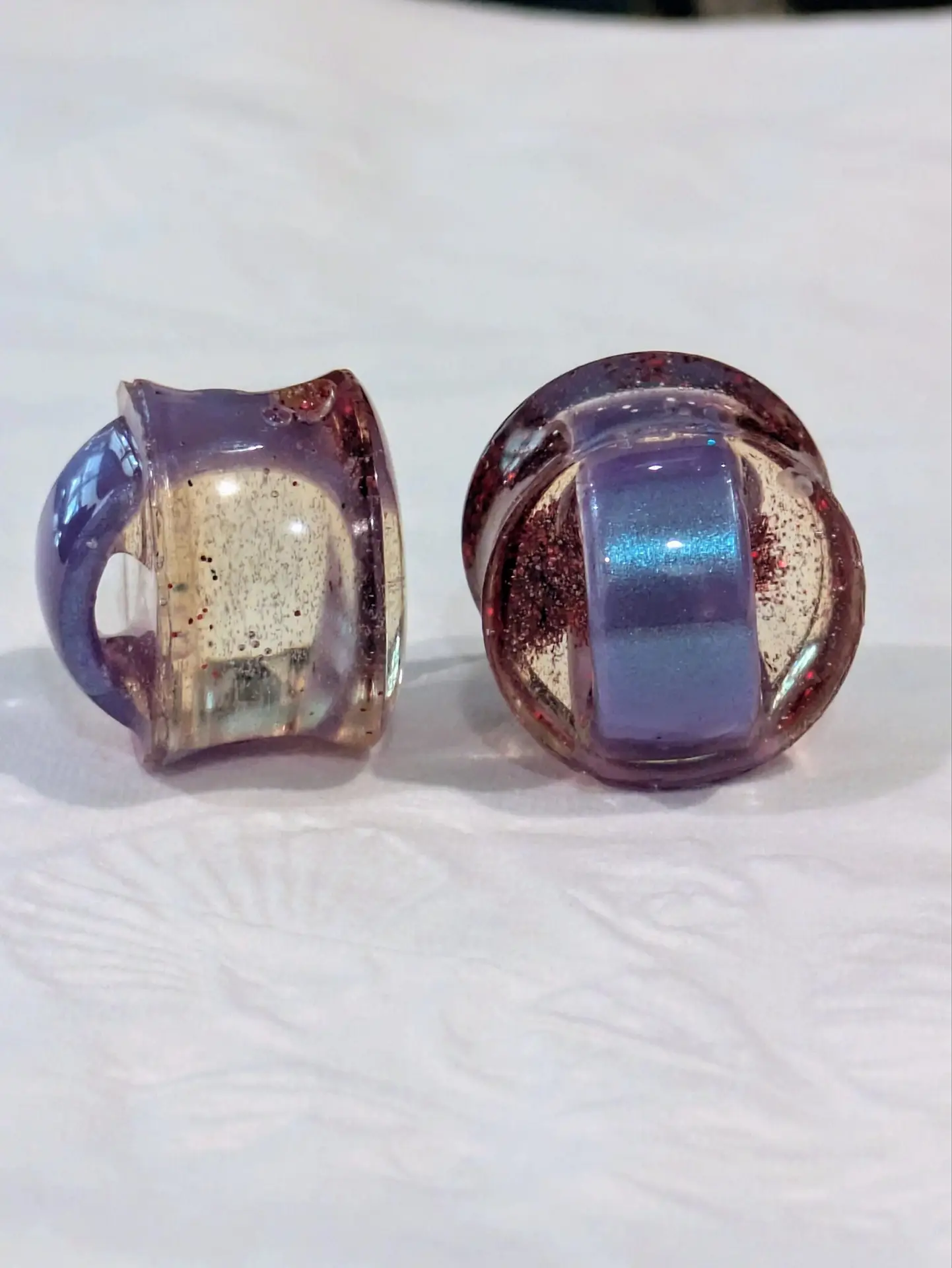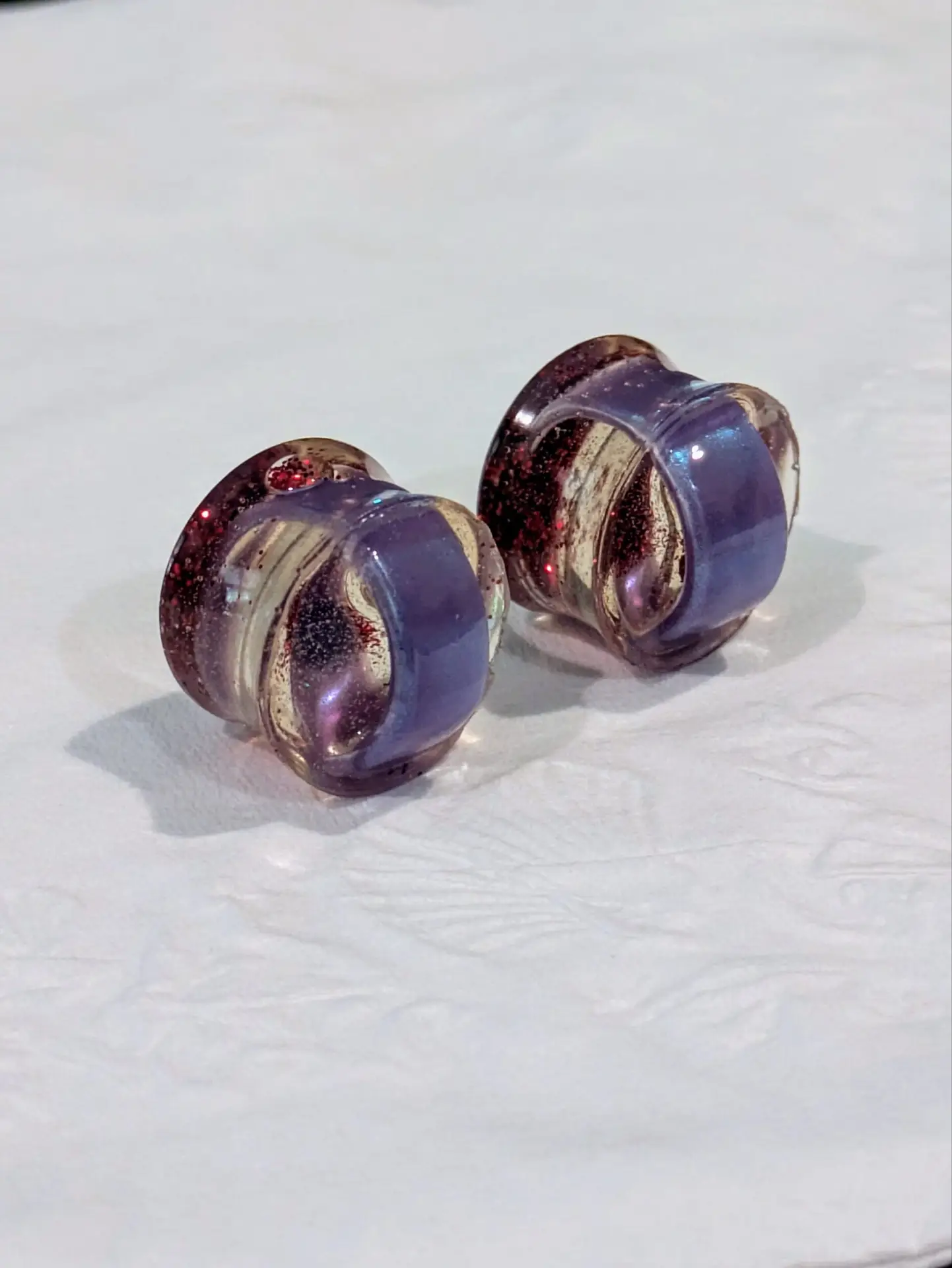 Handmade and one of a kind resin gauges for stretched ears made with Up-Cycled UV & Metallic Polypro Shavings from our Hoops!
