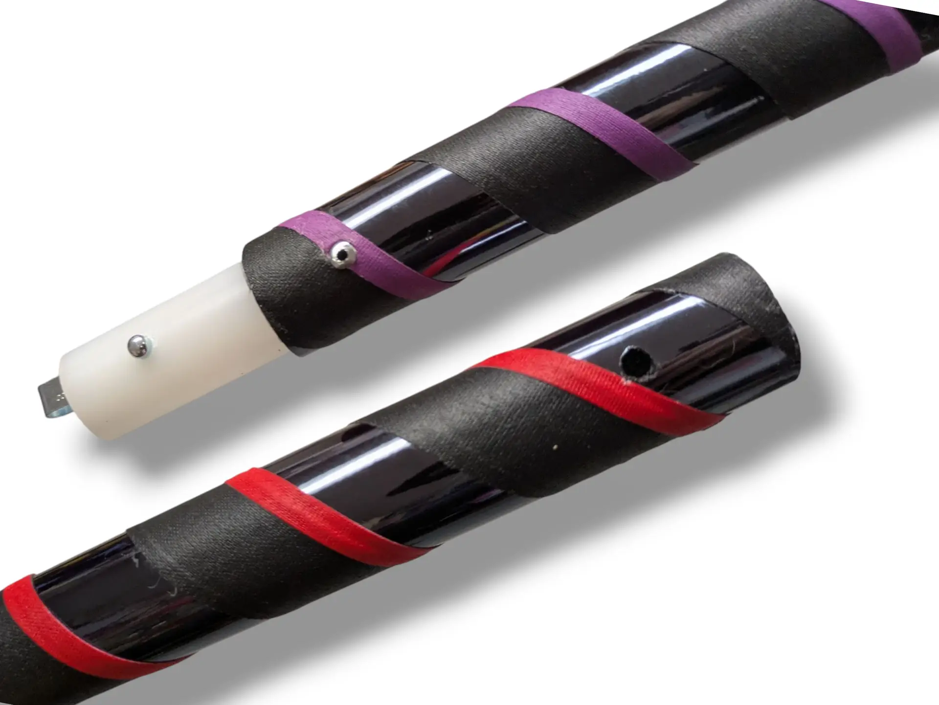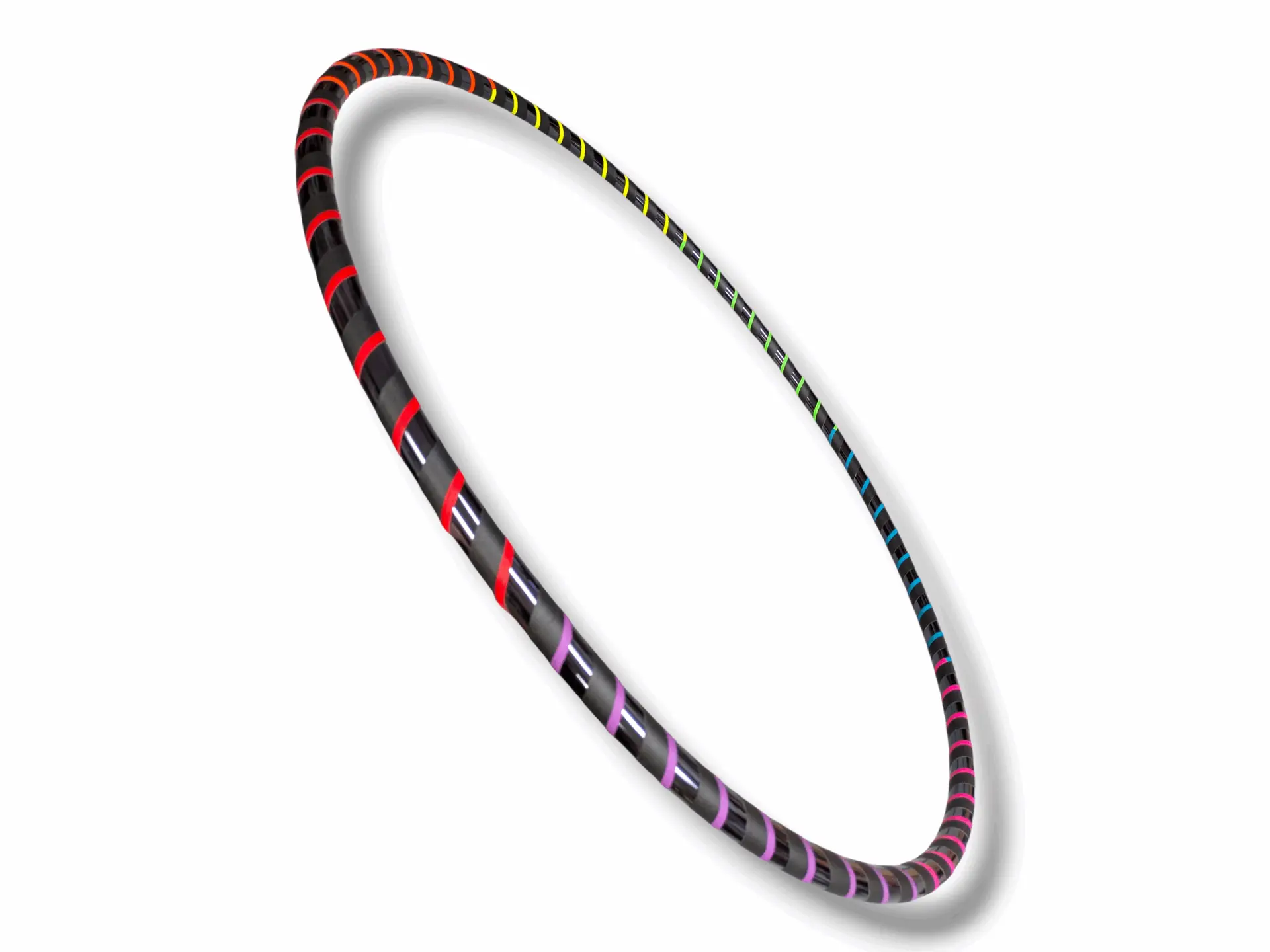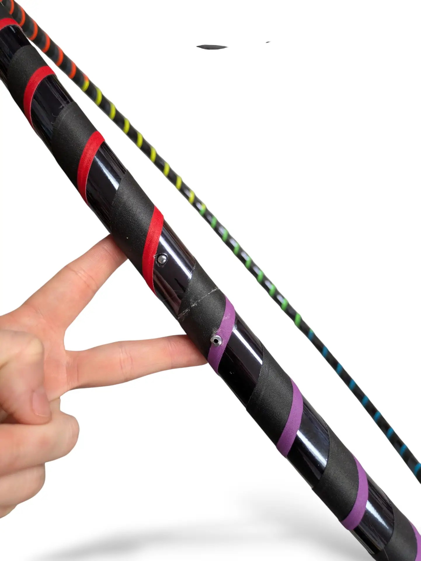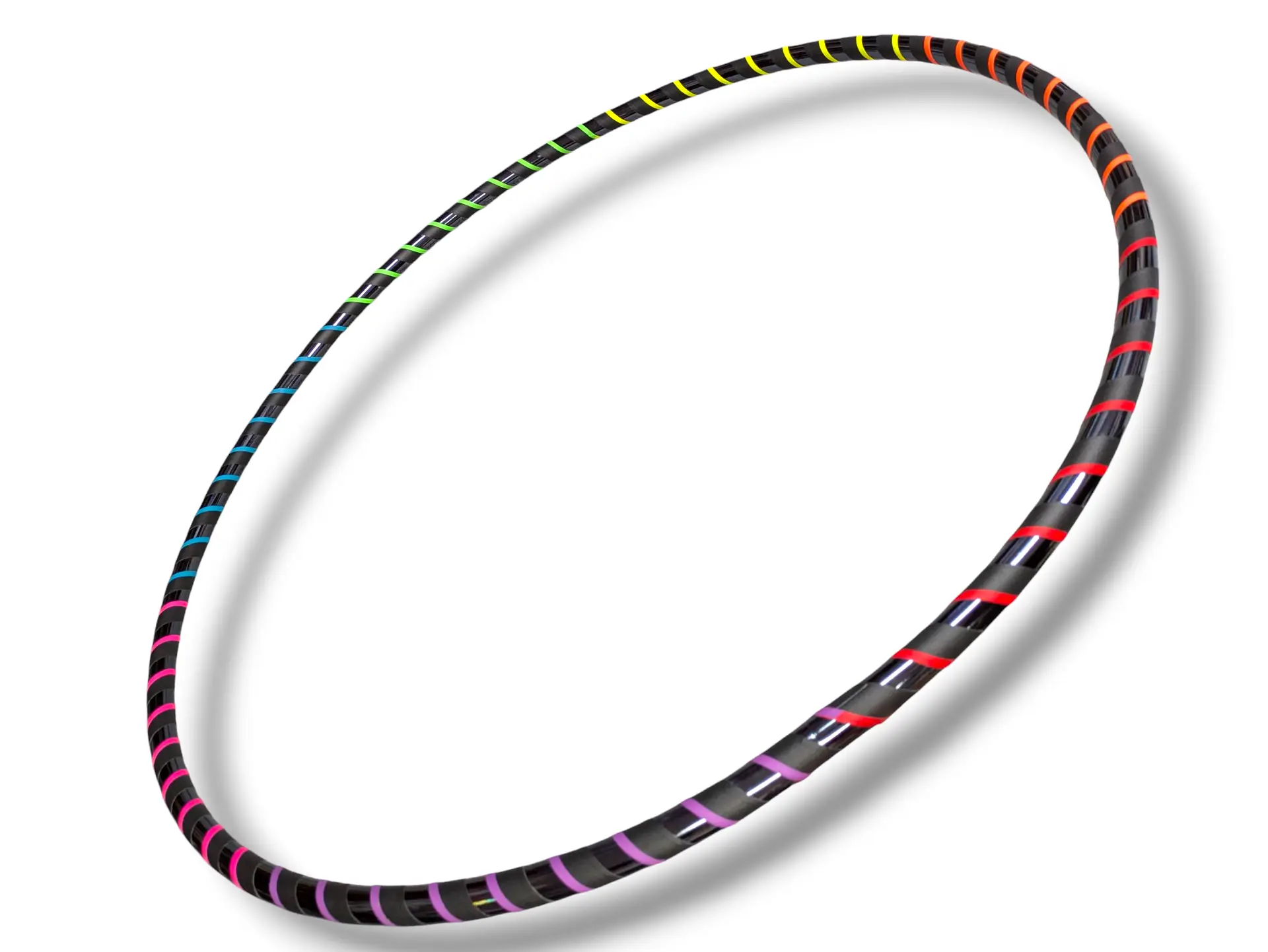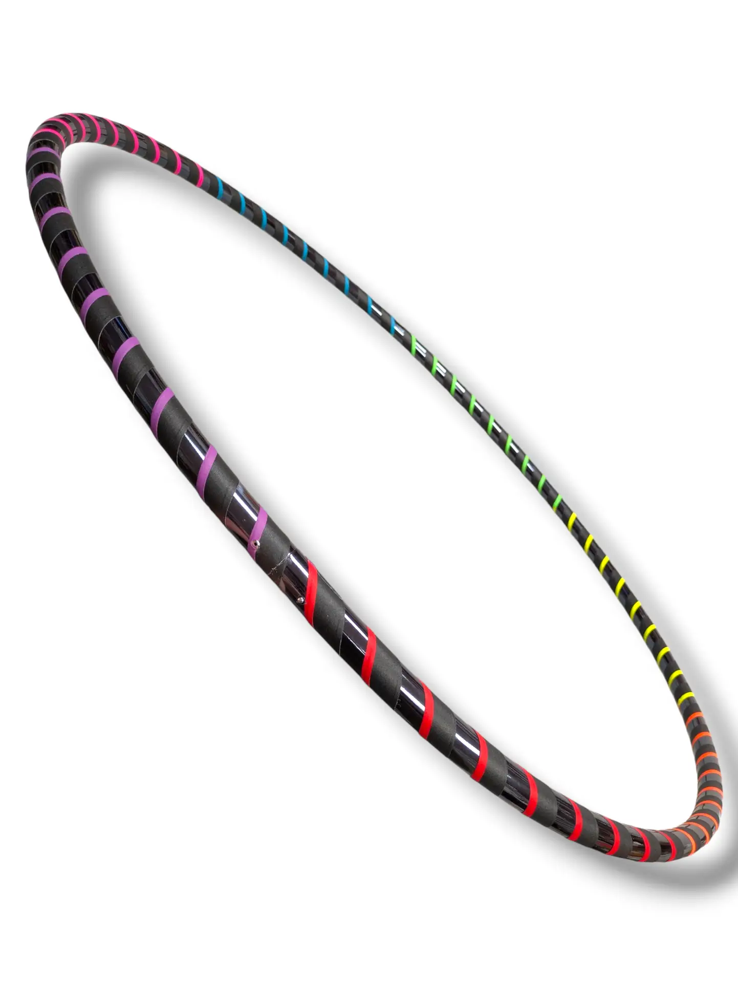 1″ Polyethylene (PE) hula hoop taped with black mirror tape, black gaffer tape, and sealed with a rainbow of 1/8″ pinstriped rainbow gaffer.