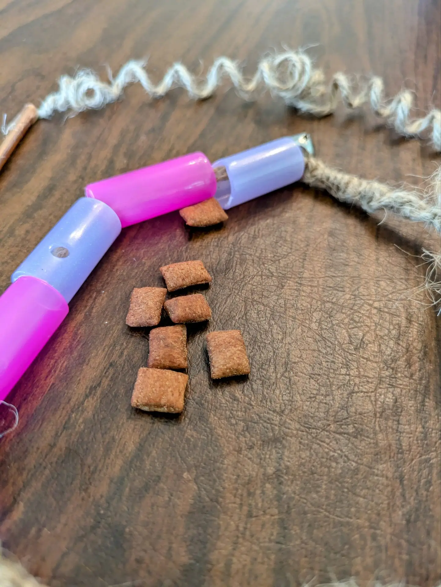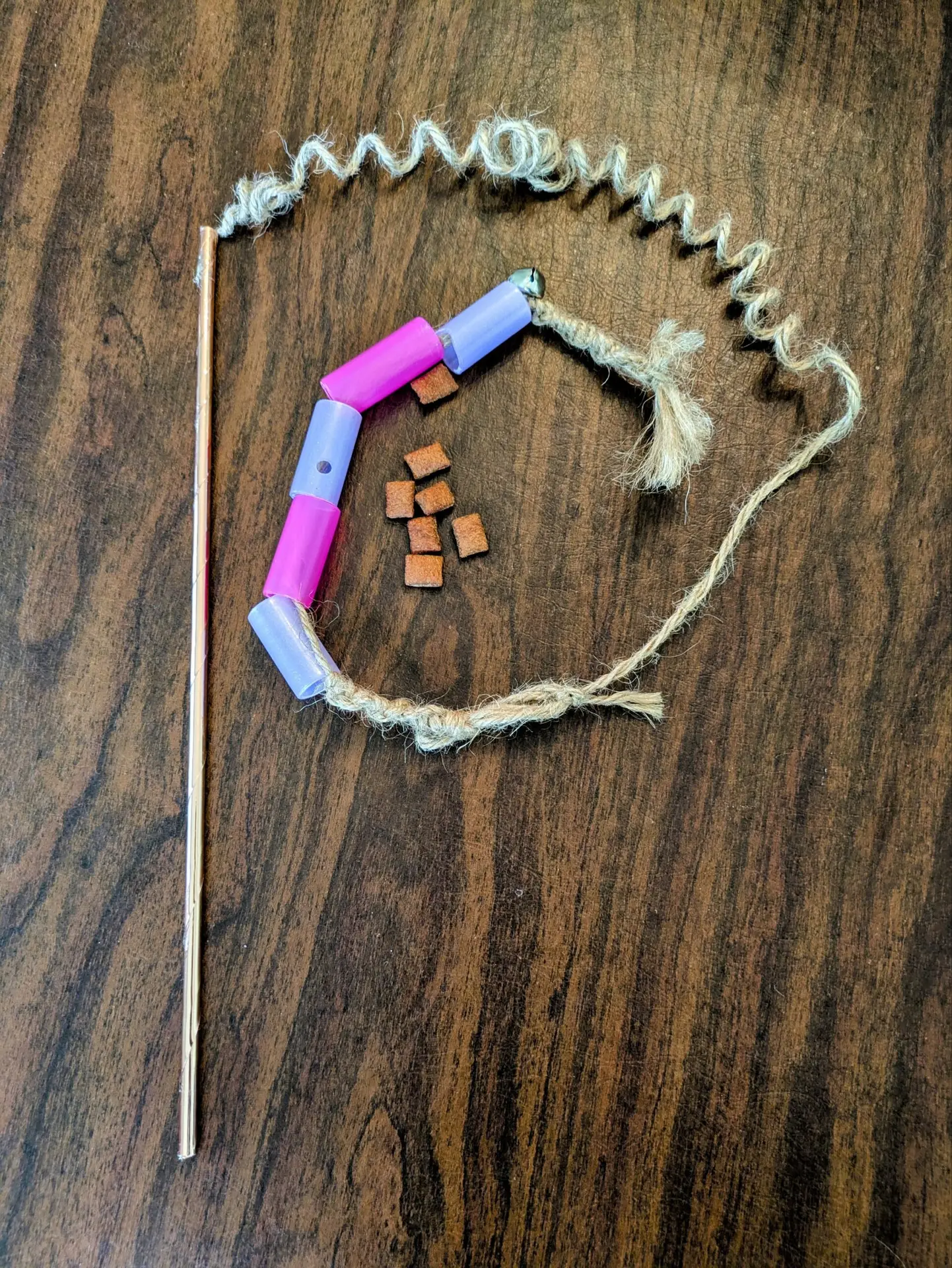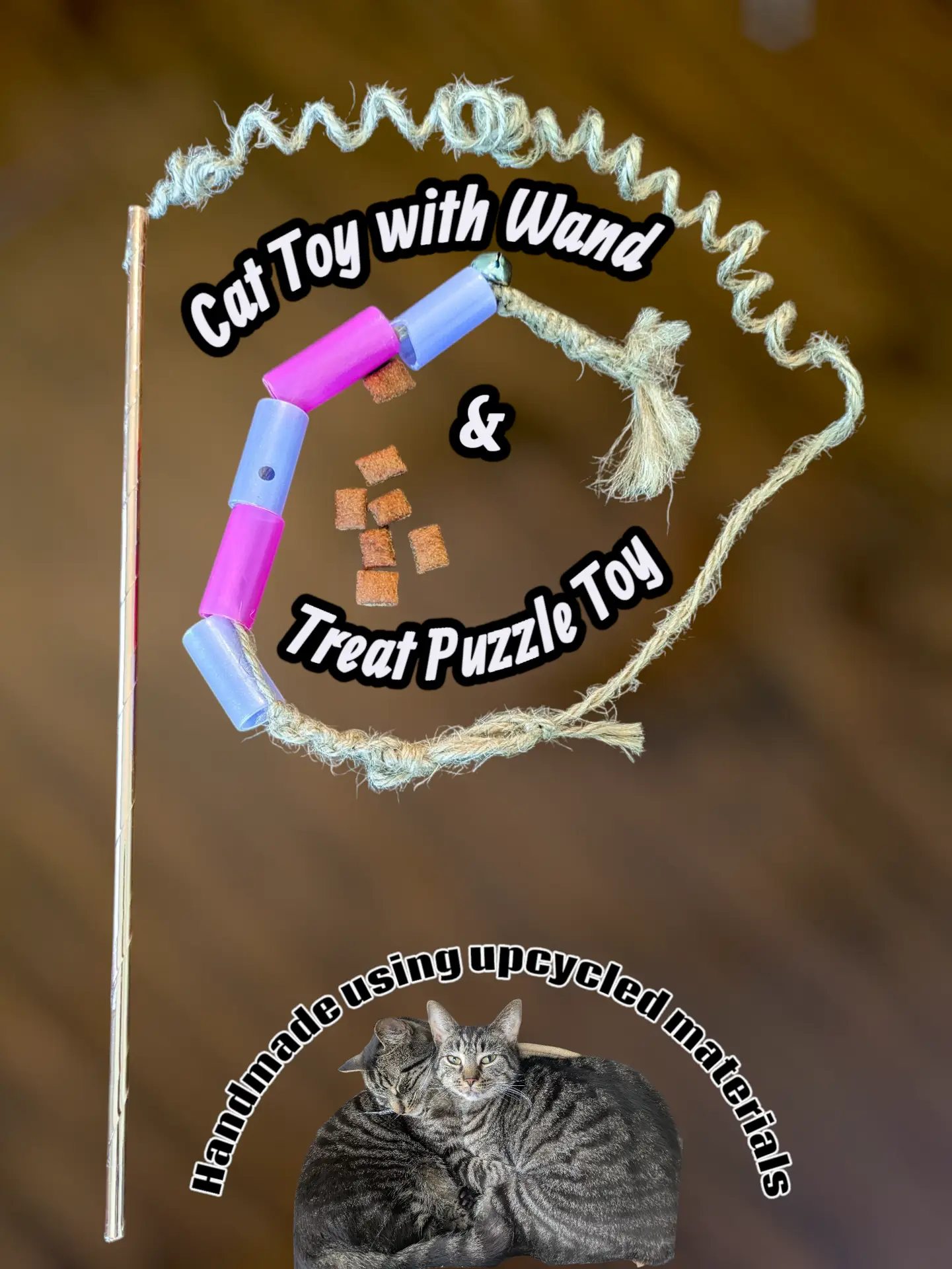 Cat Toy Wand & Treat Puzzle Toy made using recycled hula hoop scraps & hemp!