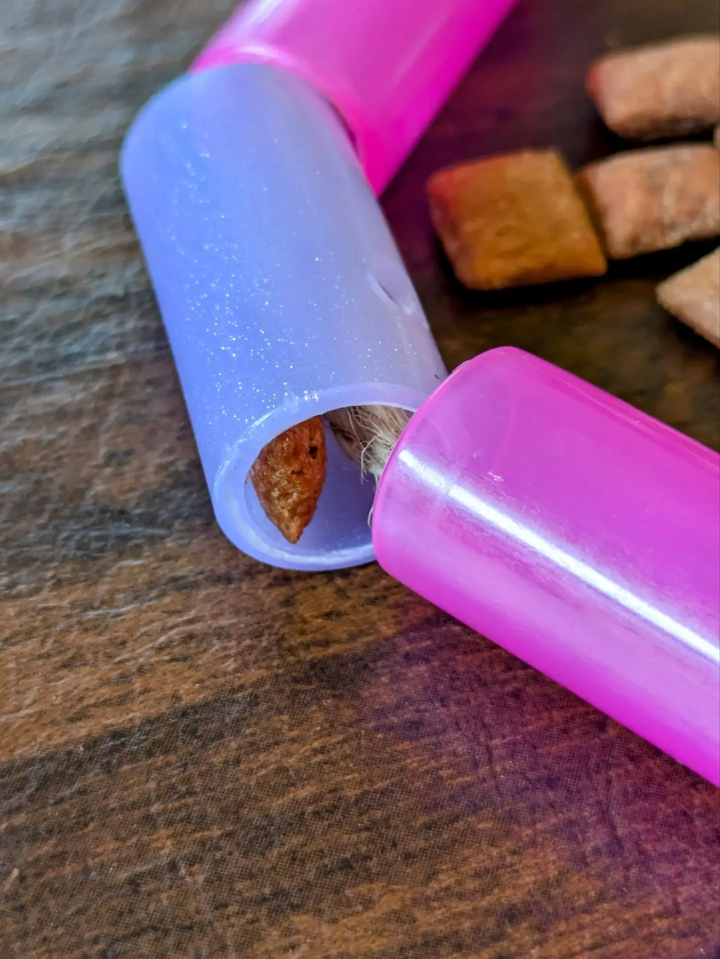 Being the cat ladies that we are, we noticed that our cats enjoyed playing with the scraps. My 8 year old daughter grabbed some string and a bag of small bells (our crafts supplies are extensive) and started making cat toys with the scraps. A few, “mom can you help me[s],” later the wands were taped and the quality control department (Twinkle & Squash) approved.