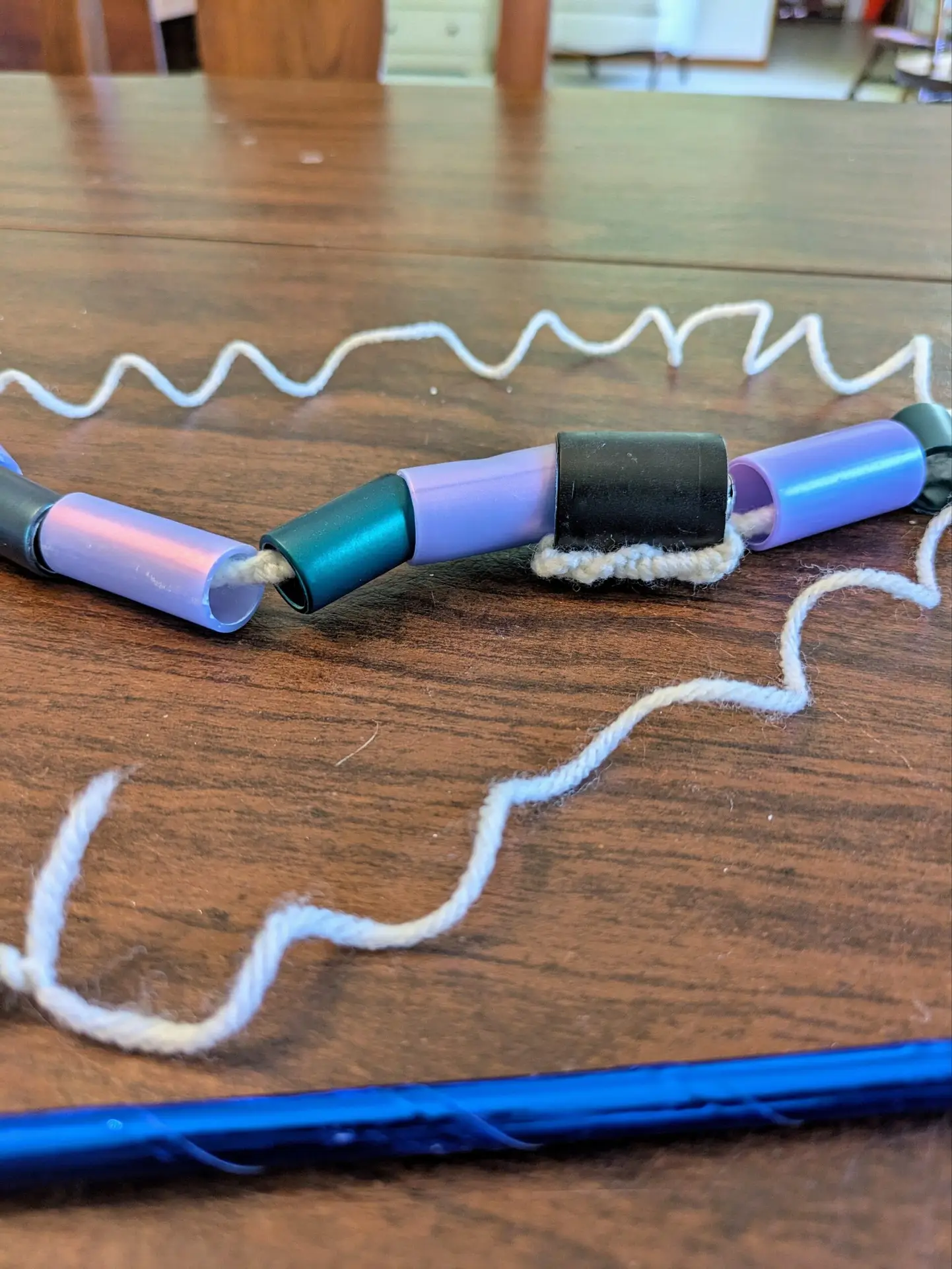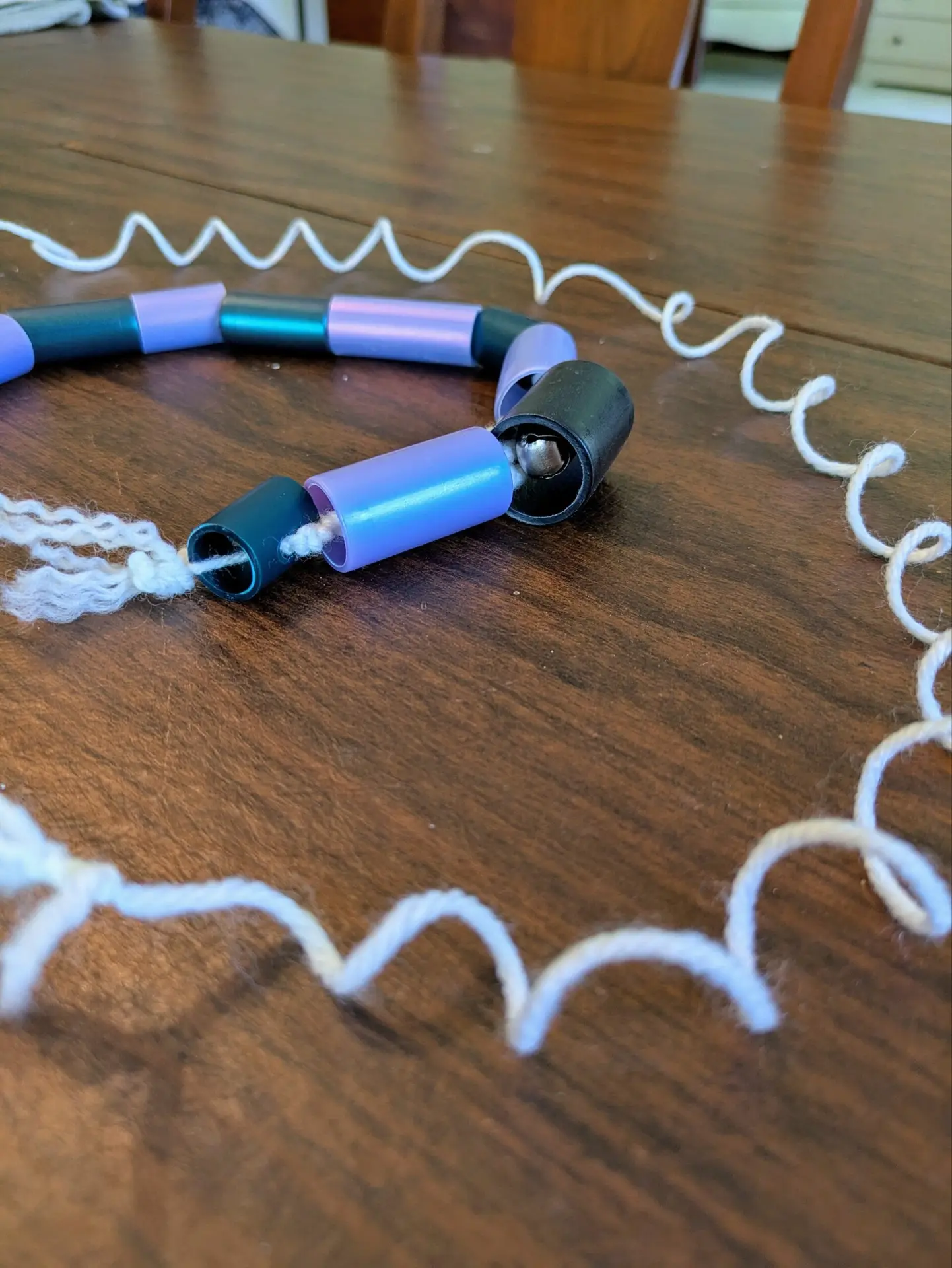 Materials: Polypropylene tubing, synthetic yarn, wood, tape.