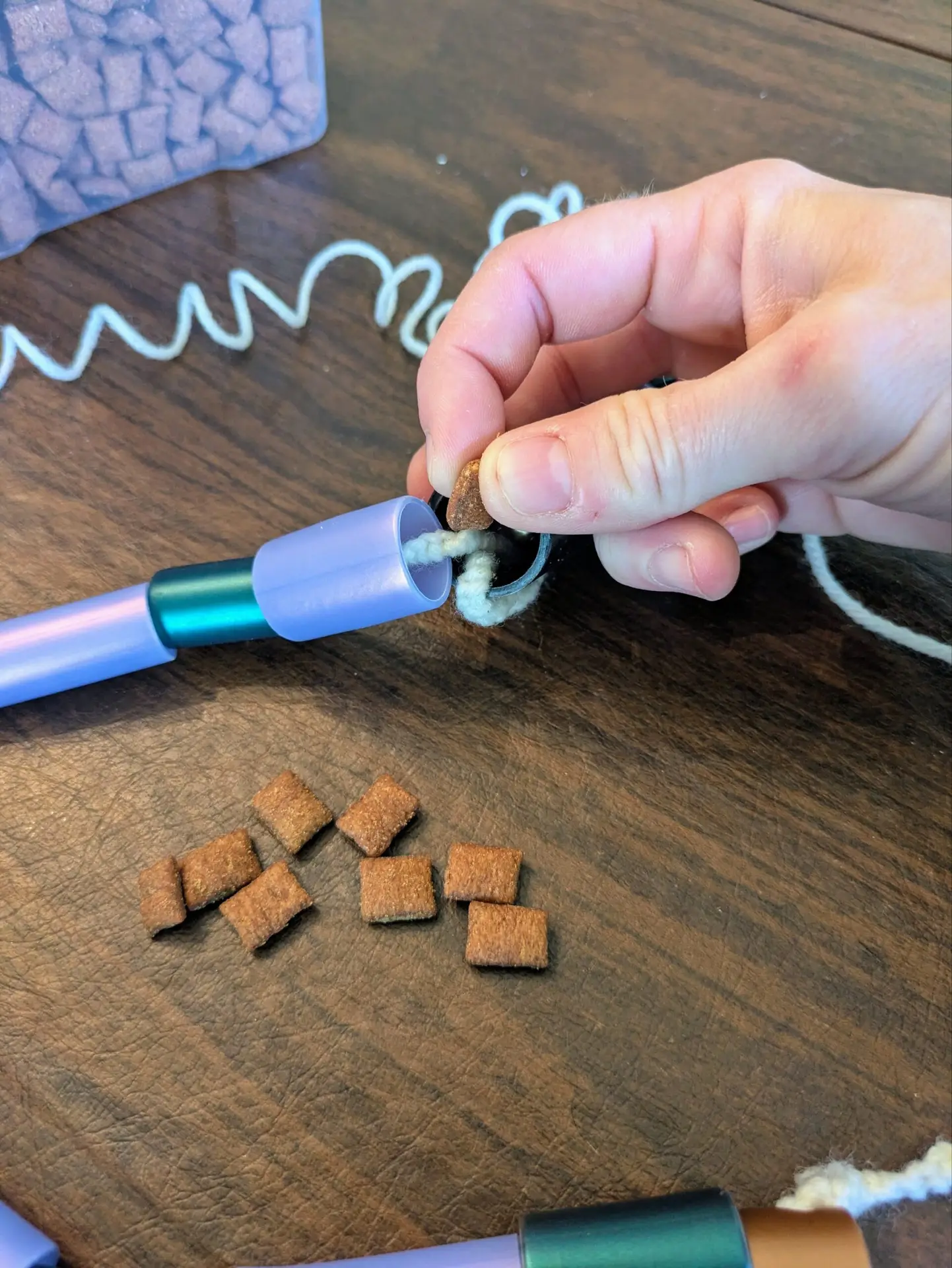 Being the cat ladies that we are, we noticed that our cats enjoyed playing with the scraps. My 8 year old daughter grabbed some yarn and a bag of small bells (our crafts supplies are extensive) and started making cat toys with the scraps. A few, “mom can you help me[s],” later the wands were taped and the quality control department (Twinkle & Squash) approved.