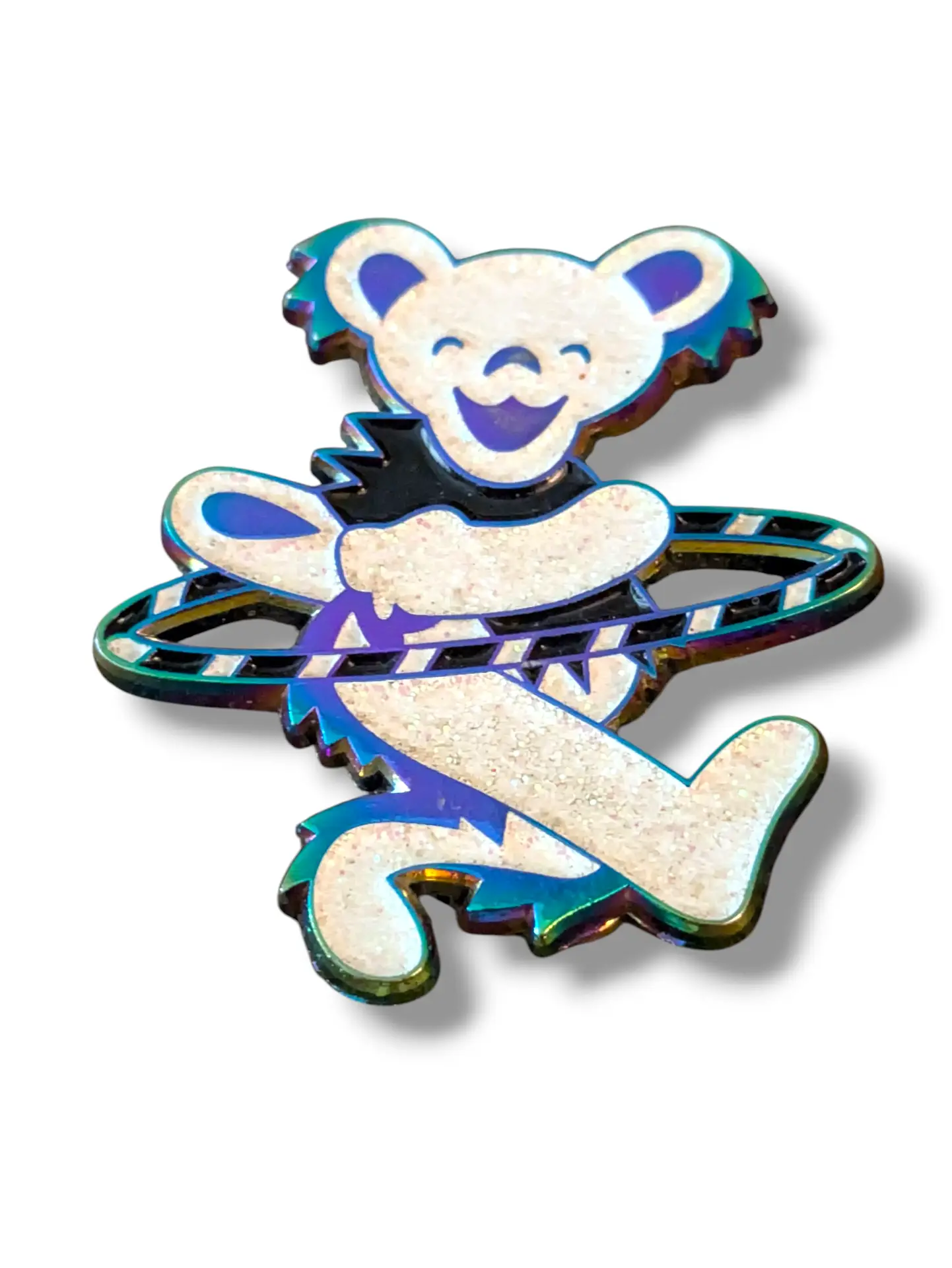 Enamel pin of a dancing bear hula hooping.