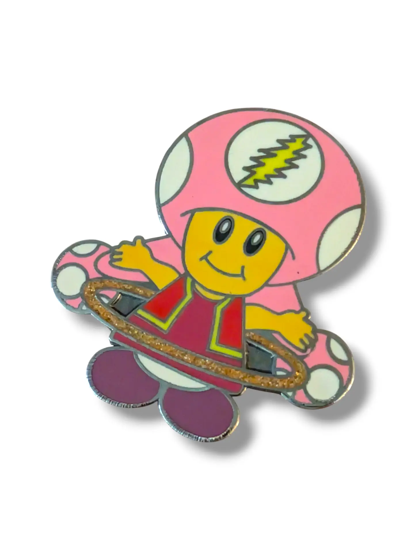 Enamel pin of a Dead Head Toadette hula hooping.