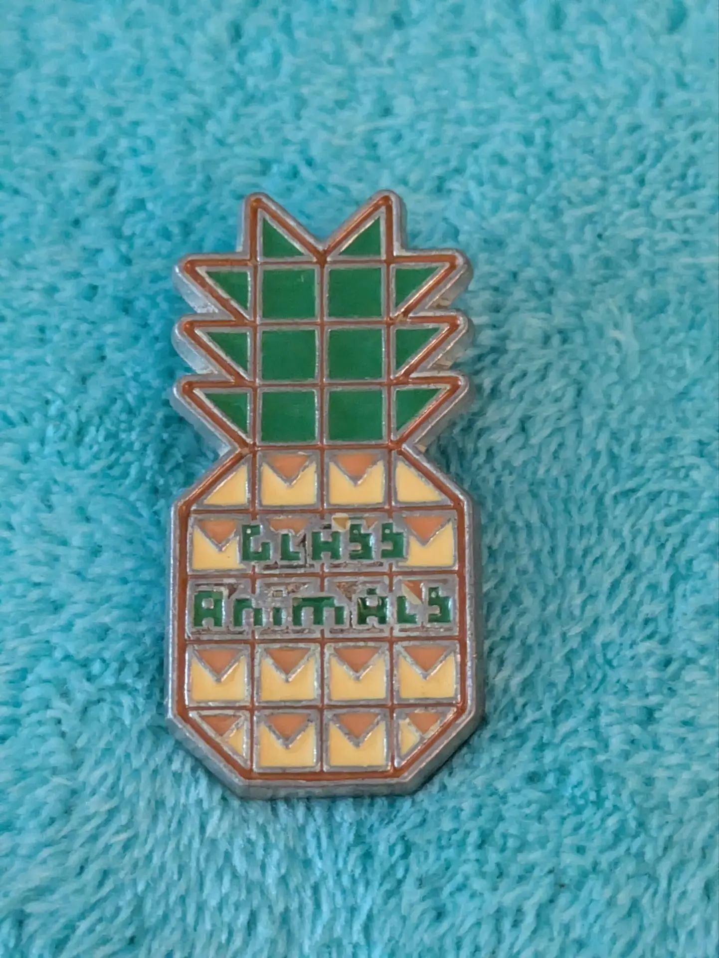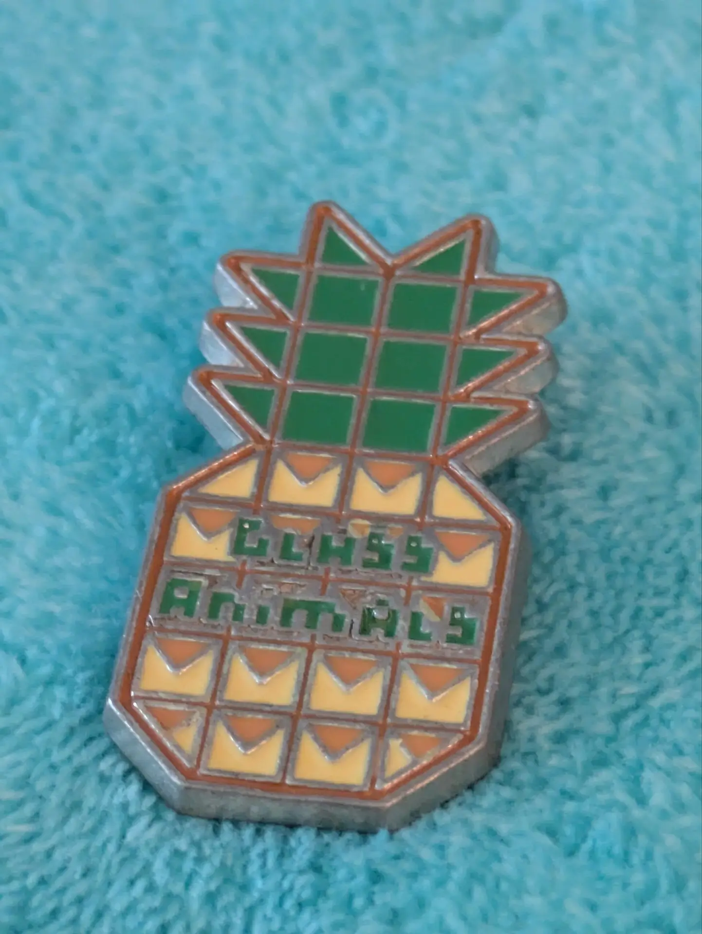 Glass Animals Pineapple Pin – used, has some damage to the metal coating and feels scratched, visibly still in alright condition.